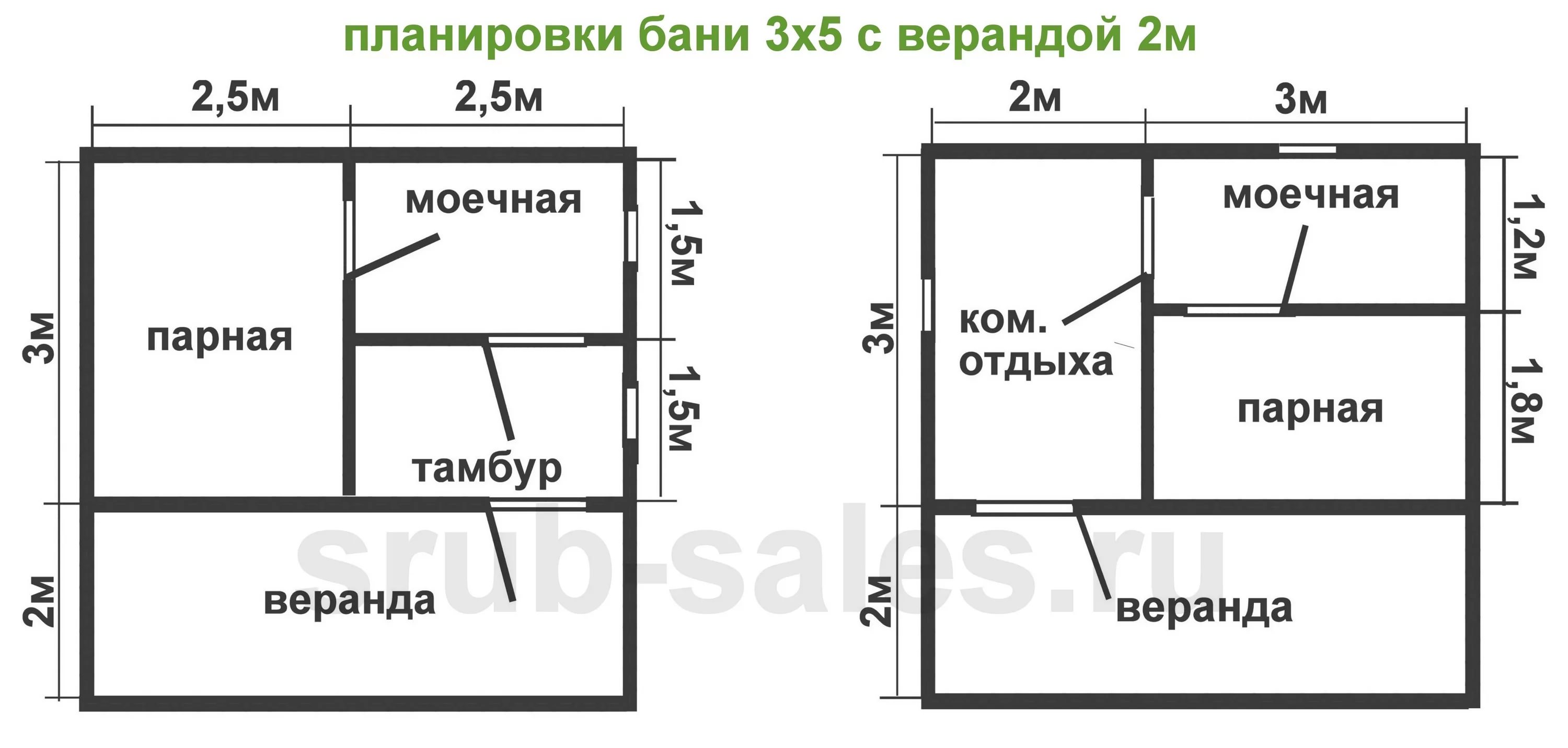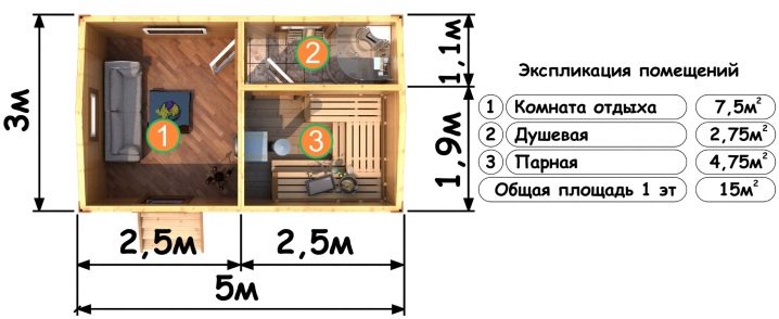 Despite the small size of the building (the bath can be even 3x3 m), the necessary rooms can be perfectly placed inside.
