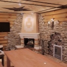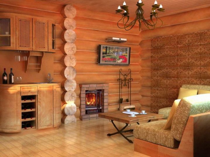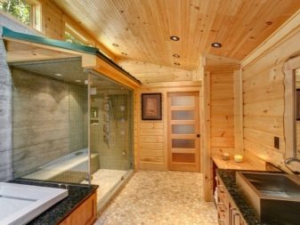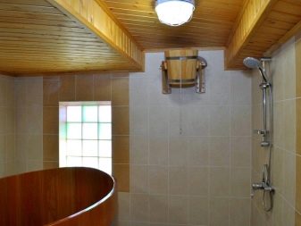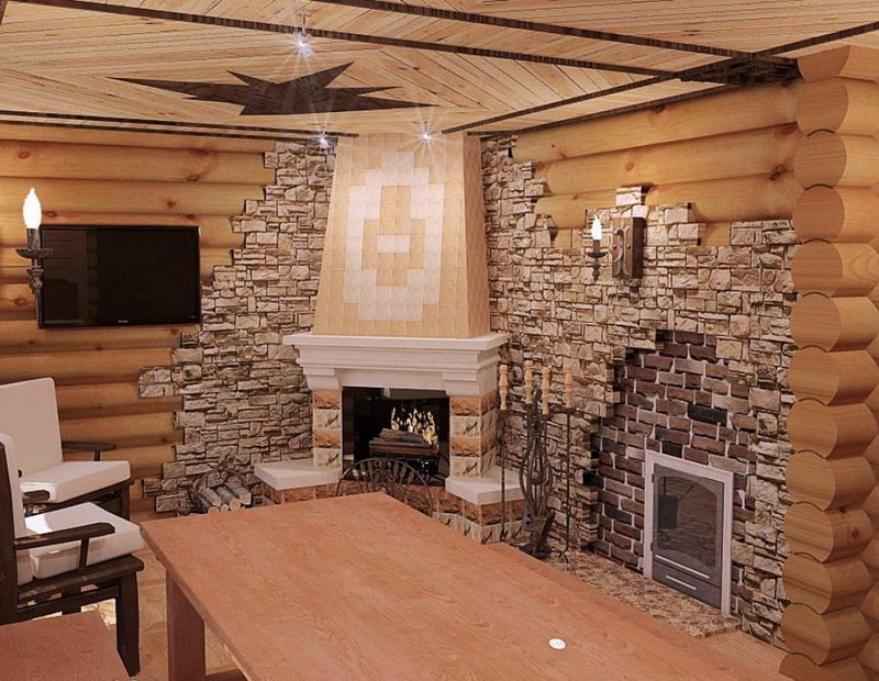 For interior walls depending on the area it is possible to use lining, a bar, the rounded log, stones, a brick, a ceramic tiledesigned for bathing facilities. And for internal ceilings - wooden beams.