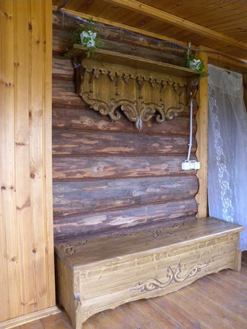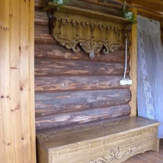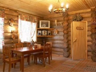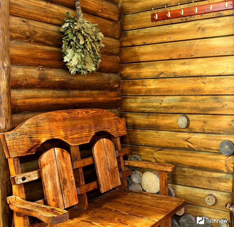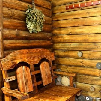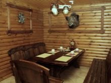 - Rustic style is considered the most suitable for any sauna.In such an interior is always appropriate massive wooden furniture with carved patterns, tablecloths and rugs. Such a bath looks not only colorful and cozy, but also practical.