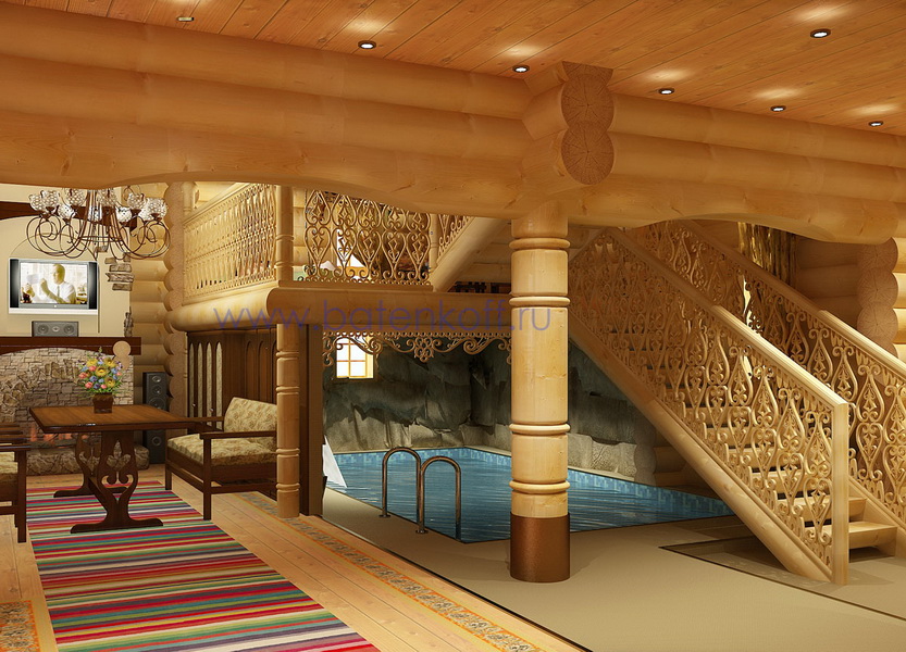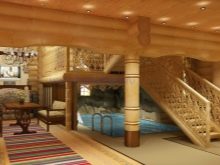 - Also for a classical bath, a setting in the spirit of alpine mountain houses is suitable - chalet style. Walls of logs and logs, the ceiling of massive beams and raw natural materials - this interior looks great in a spaciousbathhouse