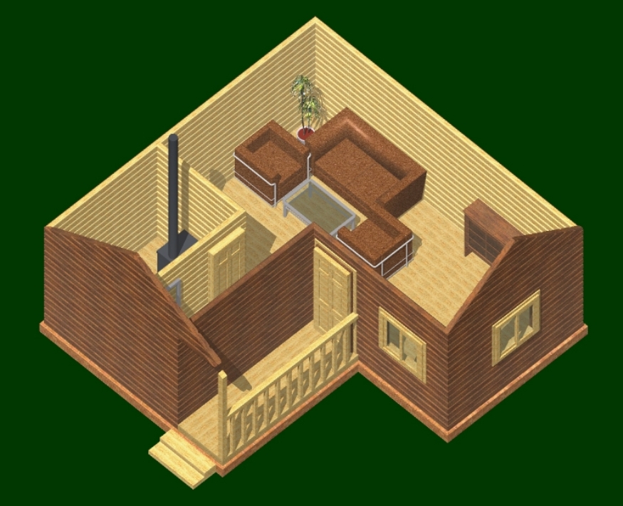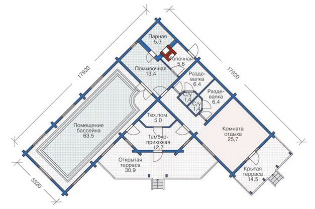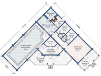 In some areas it is not always possible to allocate a large area under the bath, and in such cases you can resort to a non-standard solution. An unusual option can be considered the project corner bath. Its main feature is that the rest room and steam room relative to each other are at an angle of 90 degrees. Thus, the furnace is located in the central part and is able to heat all the rooms at once, which is especially necessary in the winter period.