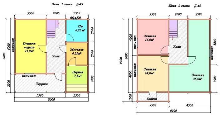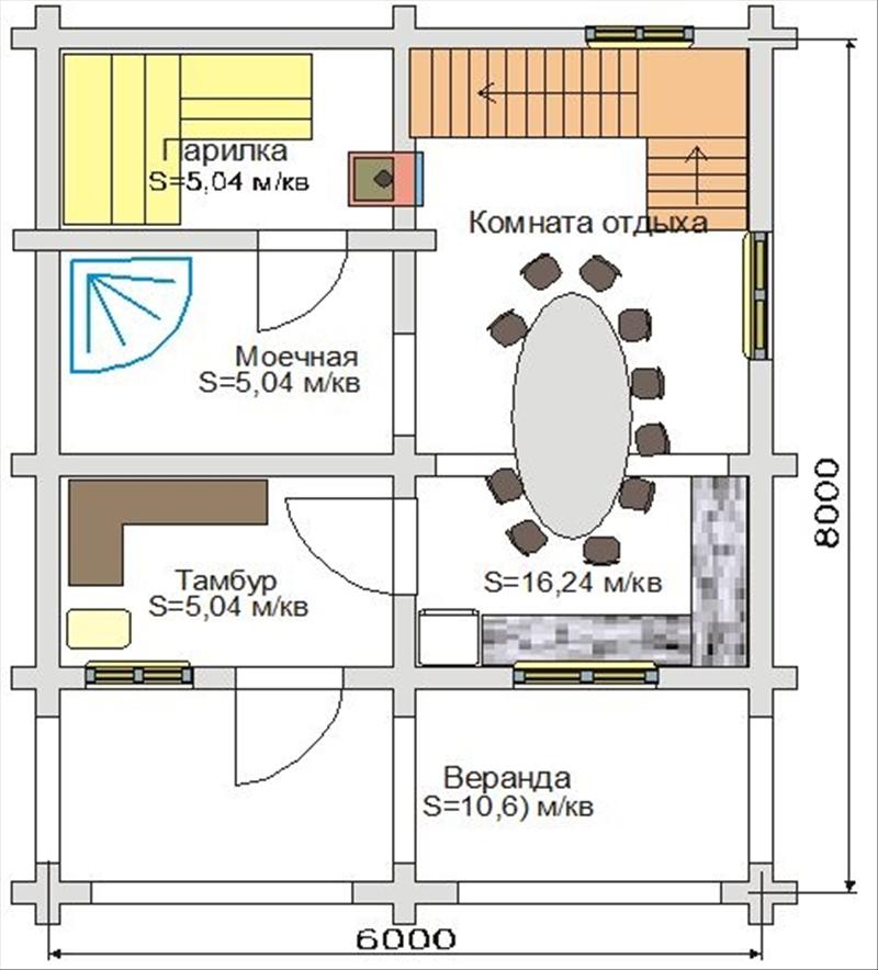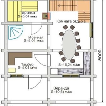 In the bath size of 8x8 or 9x8, you can provide all the necessary facilities for a comfortable stay. To be inside such a bath at the same time can up to 15 people. In addition, with a properly designed layout, everyone will find a place where you can relax after a steam room, drink tea or even sit around the fireplace.