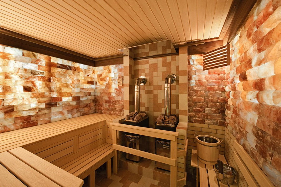 - On one of the walls near the stove, you can install a salt panel, which, like a salt lamp, when heated will fill the room with useful trace elements.