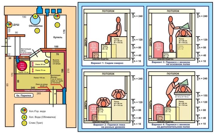 - The internal layout of the bath should be thought out to the smallest detail and include not only the marking of individual zones, but also the wiring and water supply scheme.