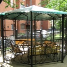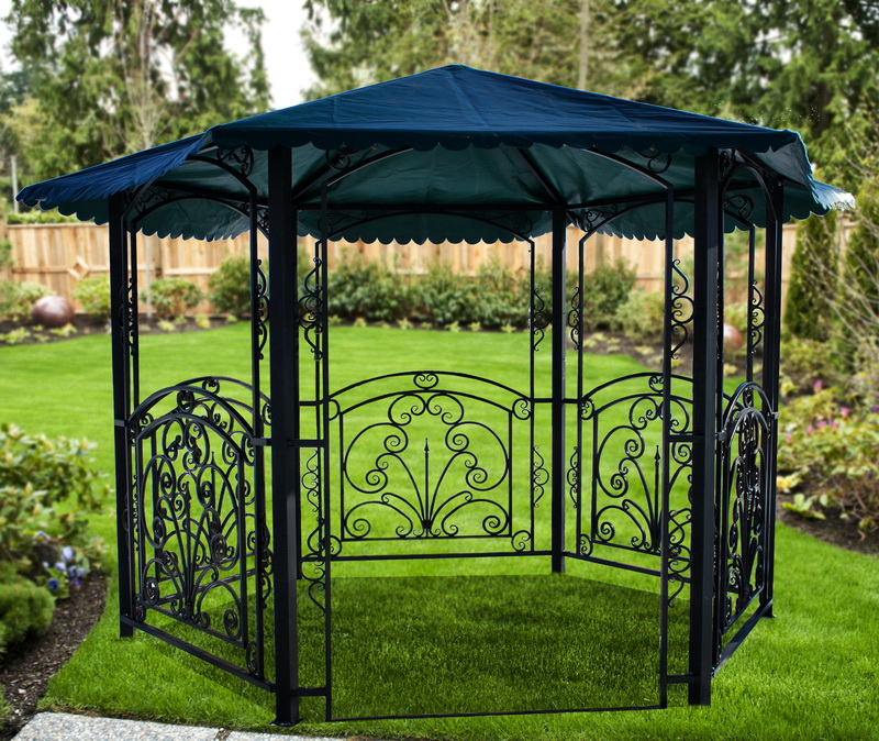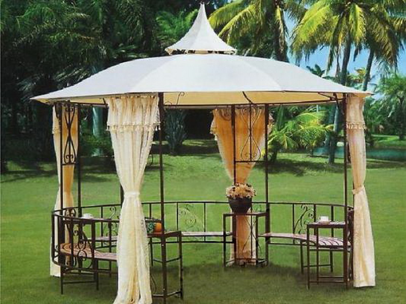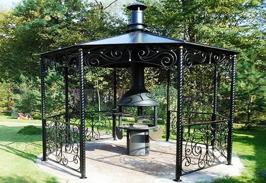 - metal gazebo goes well with wooden furniture or wicker options, a stone stove or a metal grill is appropriate and beautiful;