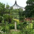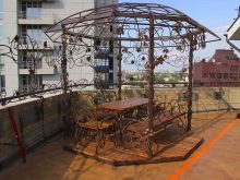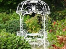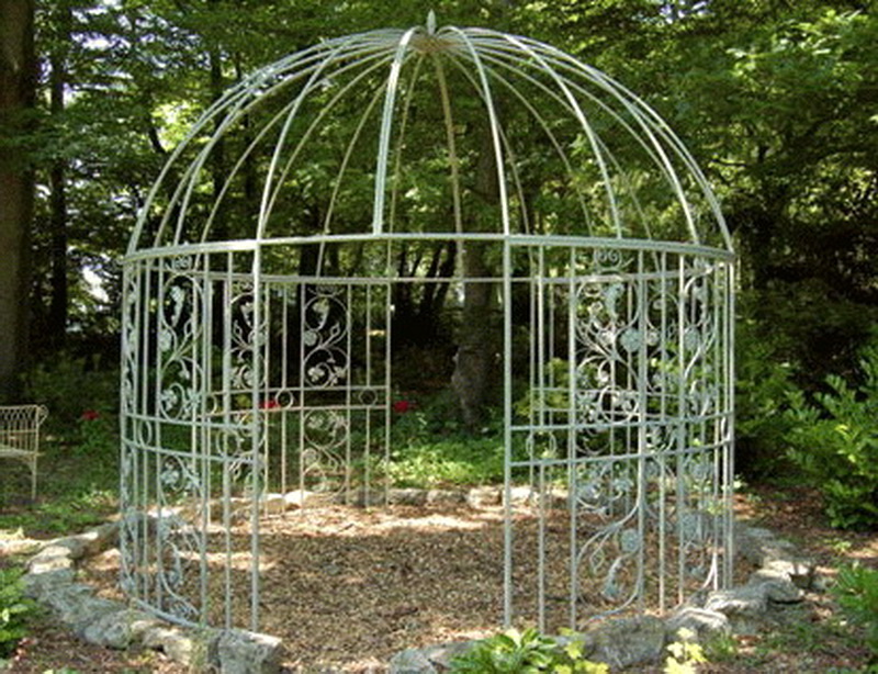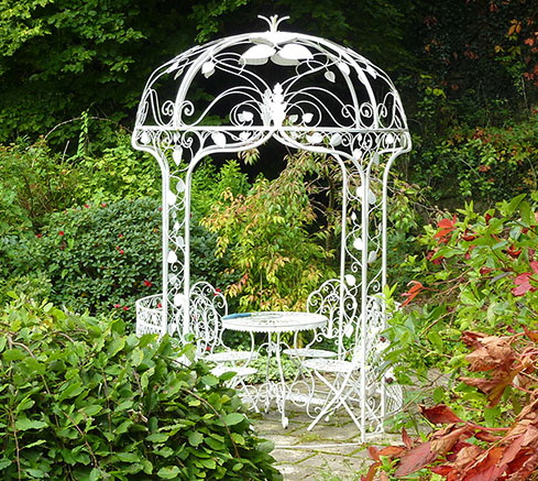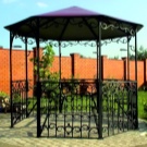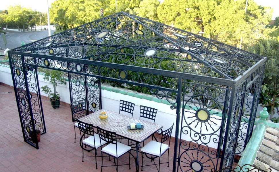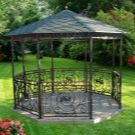 In creating the design of a wrought iron gazebo, you can give free rein to your imagination by inventing anything. It is best to adhere to some concept, so that the metal building is combined with the house or its decoration. The wrong choice of design leads to the fact that the structure looks ridiculous, sloppy or out of place. For the beautiful decoration of the arbor can be used openwork forging. All kinds of flowers, branches of plants, forged birds will look interesting and very gentle in the performance of this master.