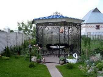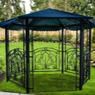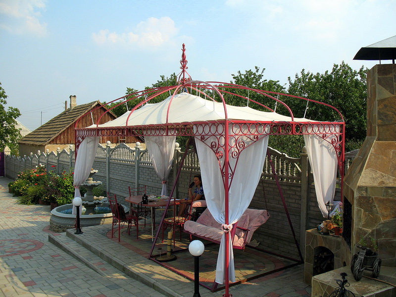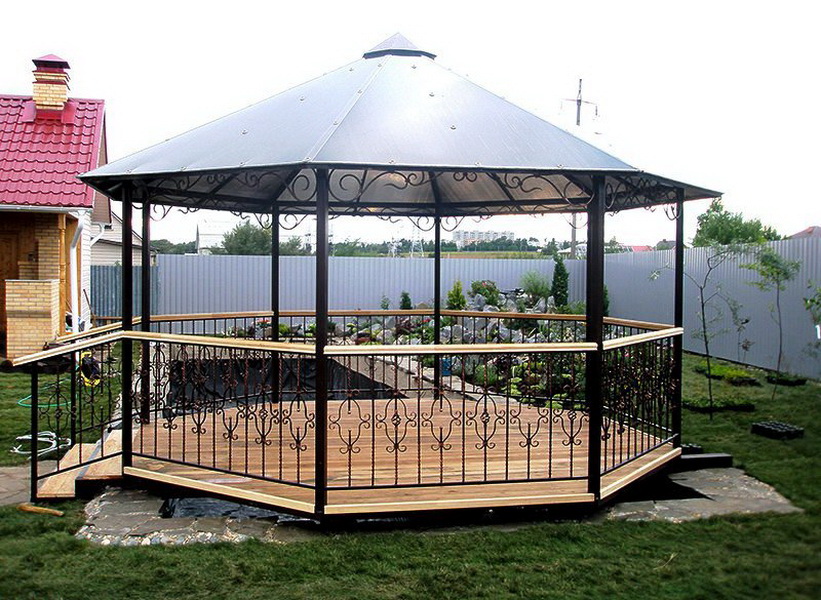 If the metal structure will be among the flowers, then its shape should be soft and ornate., lace and curls in this case will be very useful. But for those gazebos, which have considerable dimensions and will serve not only as a place of rest, but also as a barbecue and barbecue area, and maybe a playground for children, you need to use something universal, stylish and beautiful.Best of all in this case will look like geometric shapes, lines of strict and regular shape.