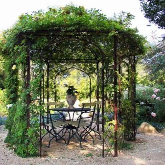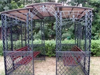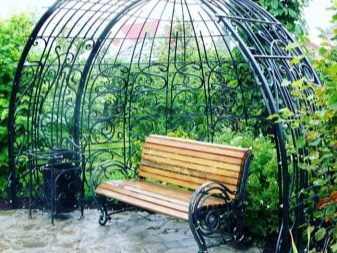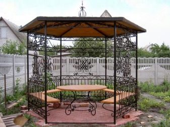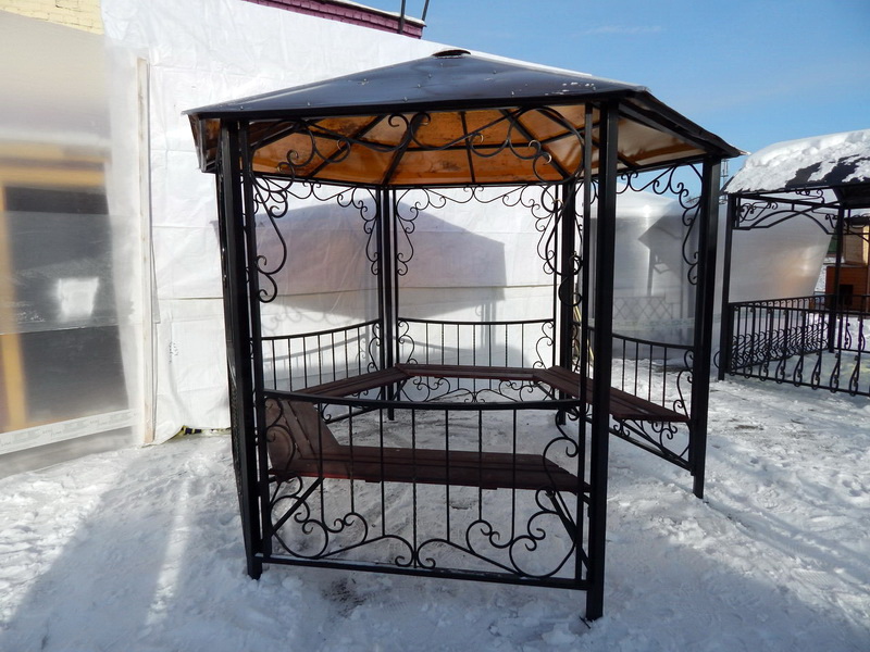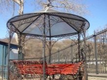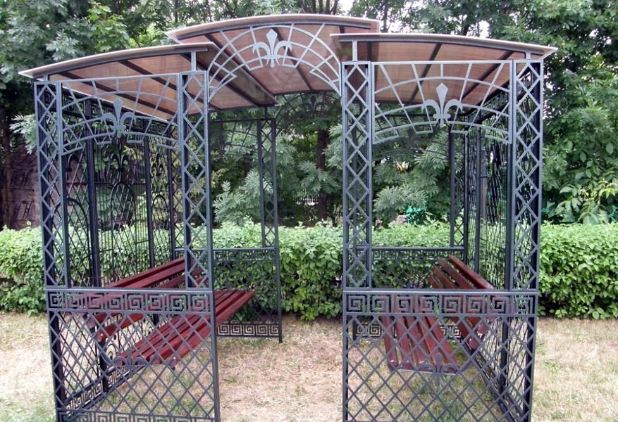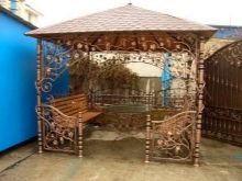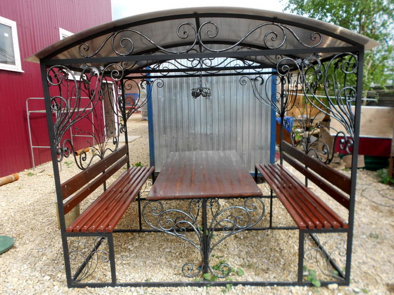 Having a private house or area where you can conveniently and beautifully arrange benches with a small table, the best solution is the construction of a whole gazebo complex. Using seats without a roof over your head is not very convenient, especially in summer, when it is very hot outside and you just need to hide from the sun. Arbor can be made from a variety of materials, but the most beautiful is metal, with which you can forge any pattern and shape. Such an arbor becomes a real work of art.