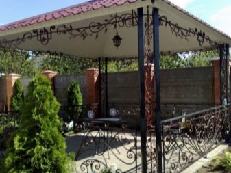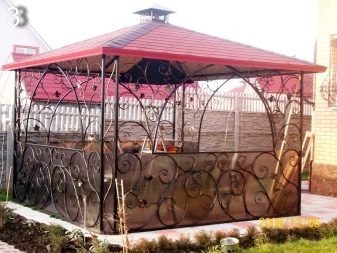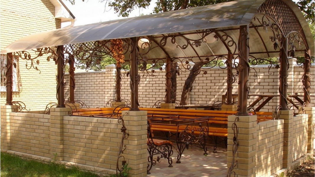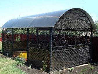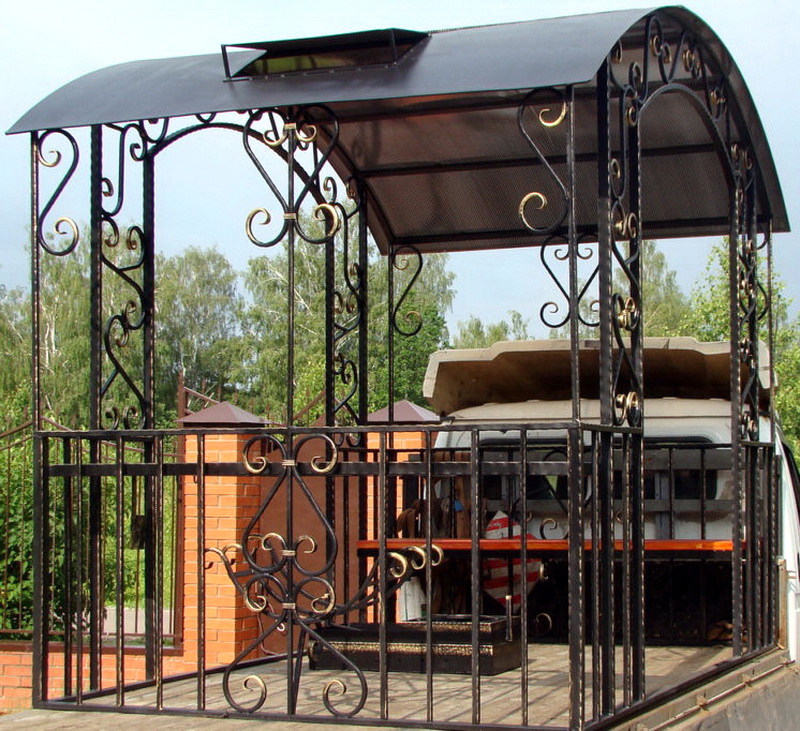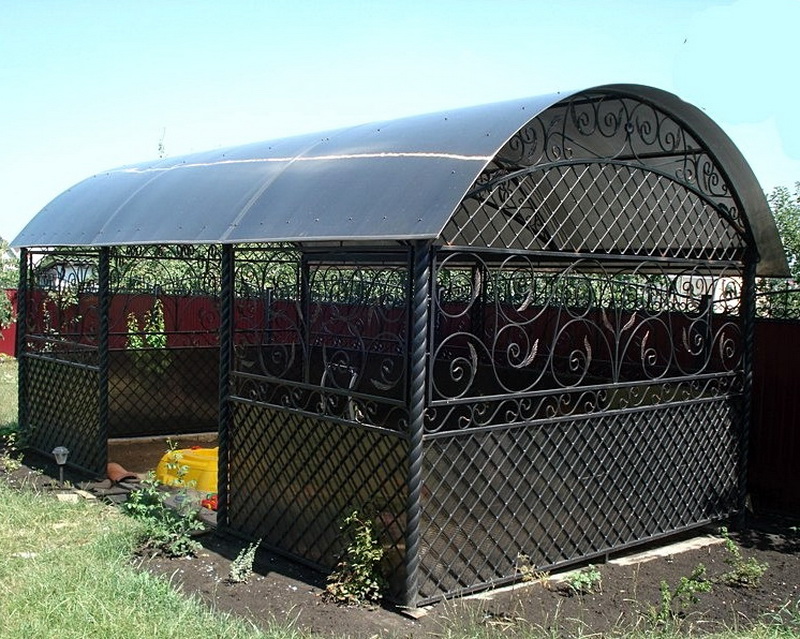 The roof can be made of polycarbonate, metal profile, wall paneling, wood. The lower part may be further framed or simply decorated with forging. The latter option is more expensive, but much more beautiful, moreover, it allows air to pass better inside the structure.