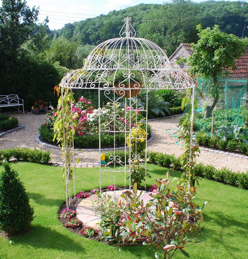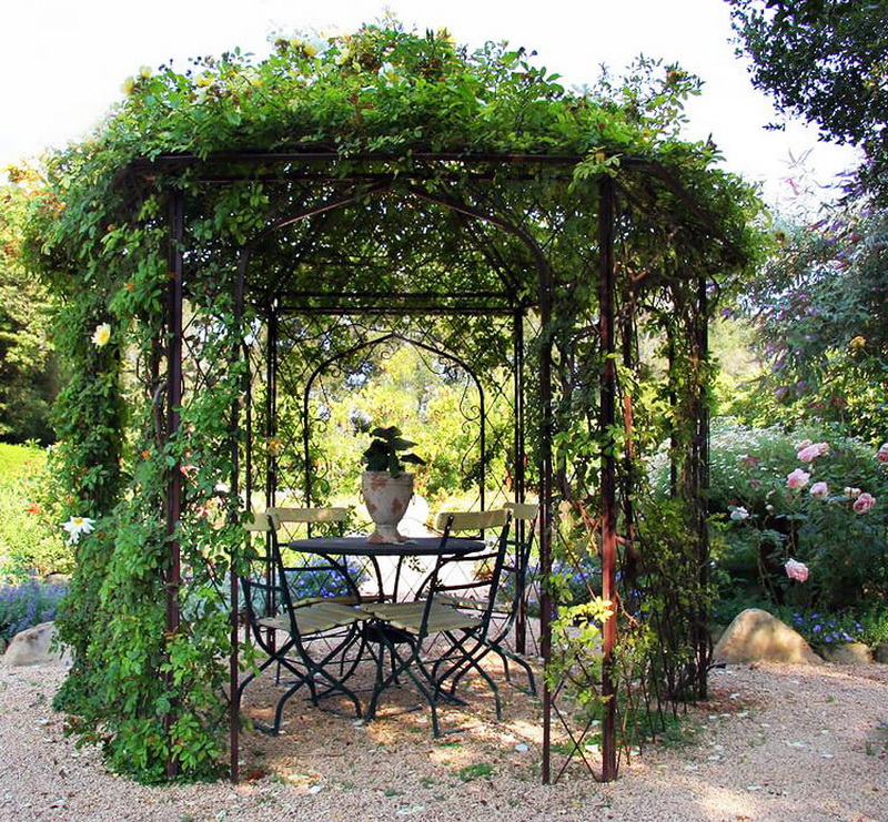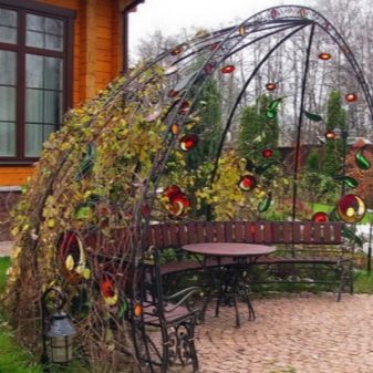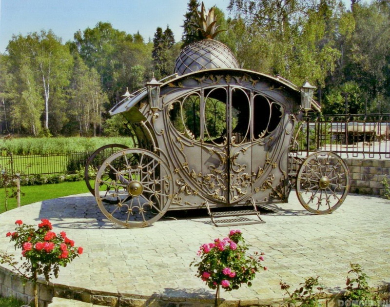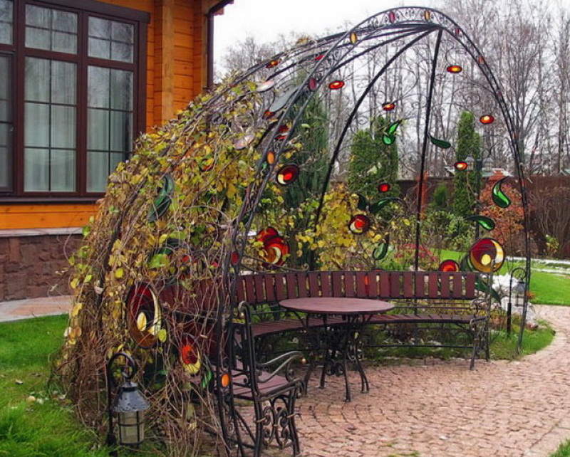 If there is an opportunity to do something special, then exclusive gazebos in the form of a carriage, a magic pumpkin or something similar will look amazing on the site, and most of all this kids will love this area. In addition to the use of the metal itself, it is possible to complement the construction with wood and stone so that the building looks more capital, solid and durable. Arbor with the use of natural materials will last a long time and will please the eyes of the owners, although in terms of care, additional efforts will be required. If plastic or similar elements are added to forging, the appearance will not be so stylish and expensive, but it will be very easy to take care of the structure.