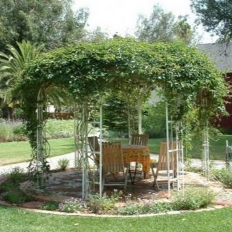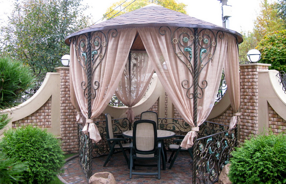 The use of a round shape is ideal for a small area where you want to organize a beautiful and functional area. A lightweight version of the arbor itself in the form of racks and the bottom of the frame with beautiful elements of artistic forging is compensated by the presence of textiles on top. This technique allows you to make the construction easier and more airy, moreover, more refined. But, on the other hand, there is always the possibility of sheltering from an unpleasant wind or sudden rain. The roof of such an arbor often looks like a cone, but not too high; it does not pay attention to itself, at the same time being an important part of the whole arbor.
