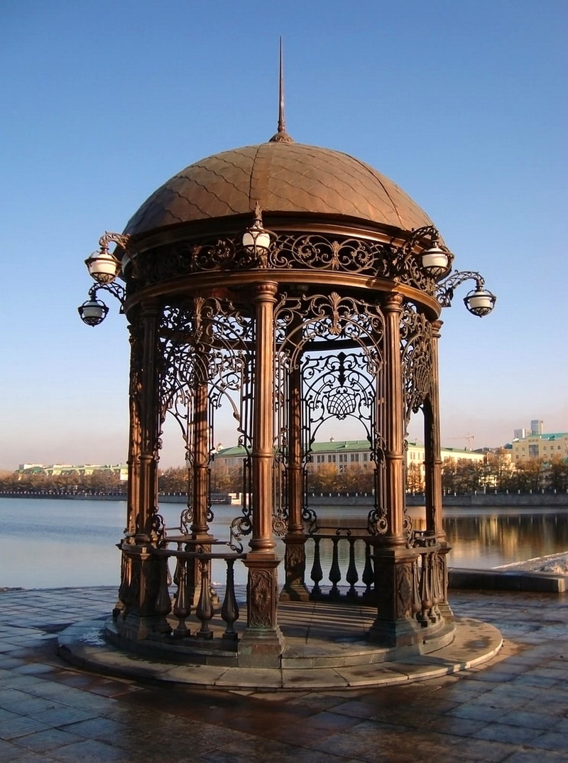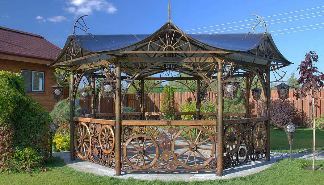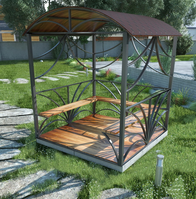 To create a beautiful metal gazebo, you can use steel, iron or copper. Planning to create an exclusive product, it is better to enlist the help of a professional, but if you have experience working with metal and special equipment, you can do everything yourself. The basis of the arbor can be made from a profile pipe, and further add the necessary details.