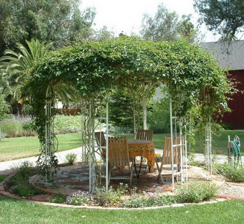 It will be very practical to create a combined arbor, where other materials are added to the metal base. The brickwork at the base of the product looks best, which contributes to the creation of optimal conditions inside, which is important for cool regions with constant winds. The roof is best made of plastic or polycarbonate, because these materials are lightweight and durable, which means they will not create a load on the structure, in addition, they can pass through part of the world,which creates a more pleasant atmosphere inside. Using the gazebo is always convenient and brings satisfaction to everyone.