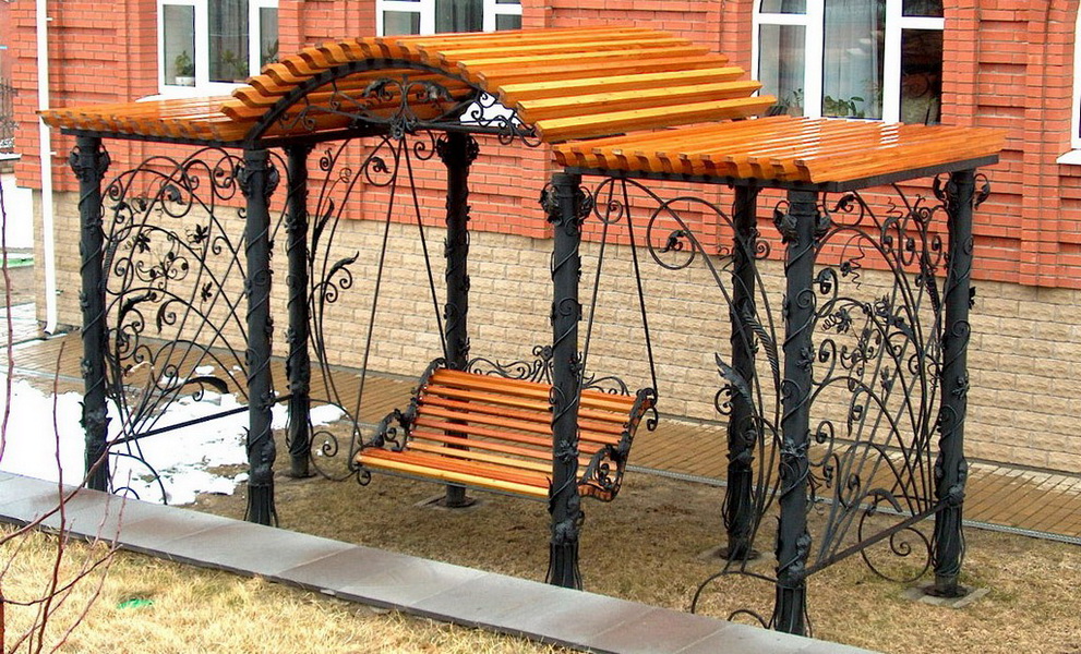 For a beautiful final product you need a master or an excellent mastery of all the skills. If there are none, this is not a reason to be upset, because with the help of arc welding, you can bend profile pipes and make an original arbor.Forging will look much more advantageous, but if there is no problem in the design aesthetics, then the alternative would be the best option. You can independently come up with ideas for design or spy on the photo of finished products. Due to the fact that the basis of such a structure is small, it is possible to do with a small columnar foundation or make a monolithic tape.