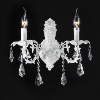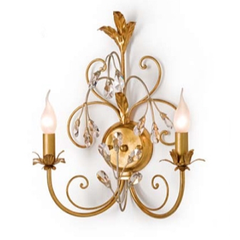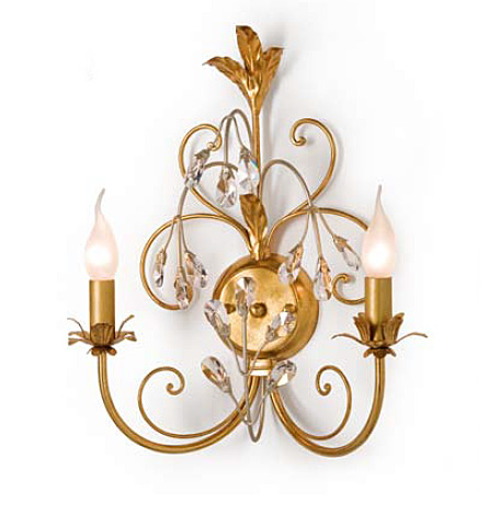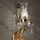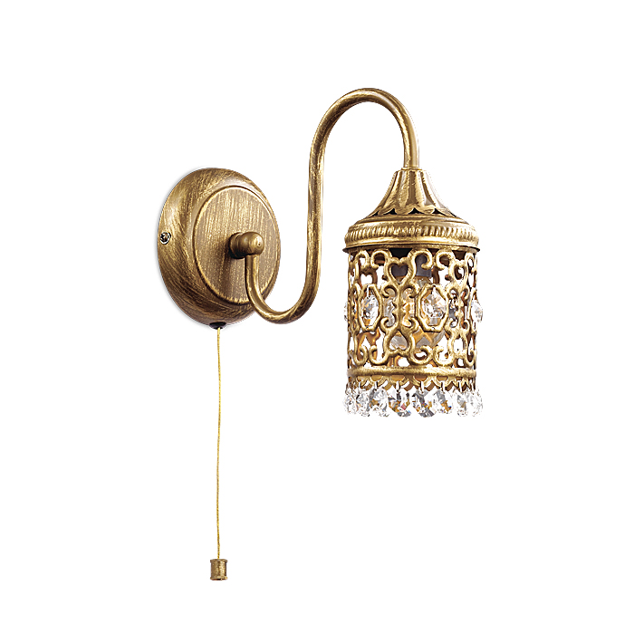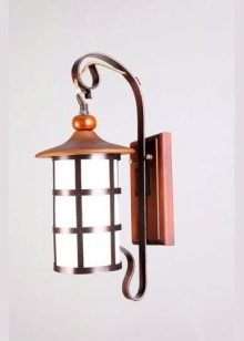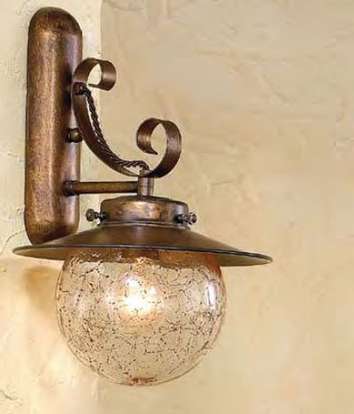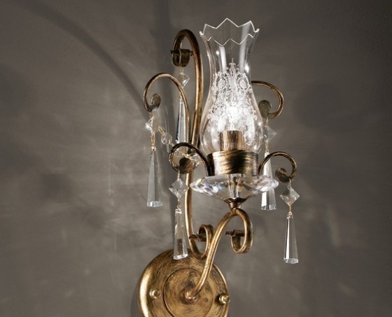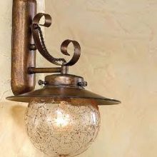 - Bronze metal wall lamp, with a wrought iron lantern decorated with crystal. Such a lamp is suitable for monophonic wallpaper.