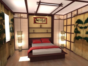 Features of the Japanese interior - windows with mats, geometric shapes, low beds and sofas, light straw chairs, light colors, subtle patterns. Design of Japanese lamps - geometric shapes, imitation of natural materials, calligraphy: