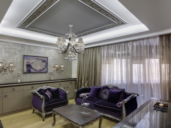 - In this living room, in the Art Deco solution, a combination of modern elements and classics is noticeable, the small shape of the ceiling lamps increases the volume of the room.