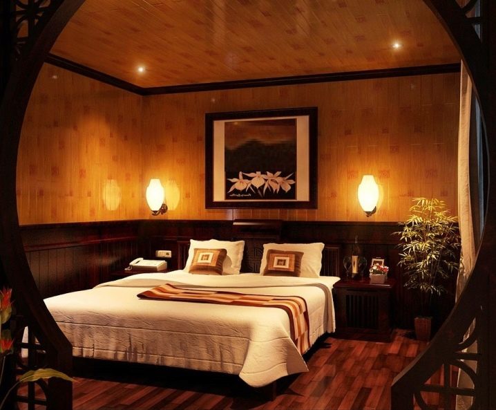 Oriental style is an abundance of bright colors, wallpaper with a pattern for fabric, low beds with colored silk pillows. The sconce in the eastern solution is easy to distinguish by the presence of: