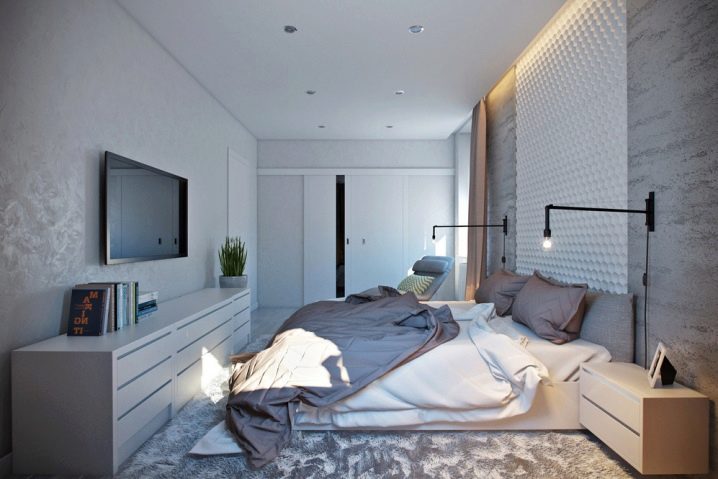 Sconces in such an interior are rarely located absolutely chaotic. They are located on the same level - especially if they are spotlights. Sometimes lamps are installed on adjacent walls, close to each other.
