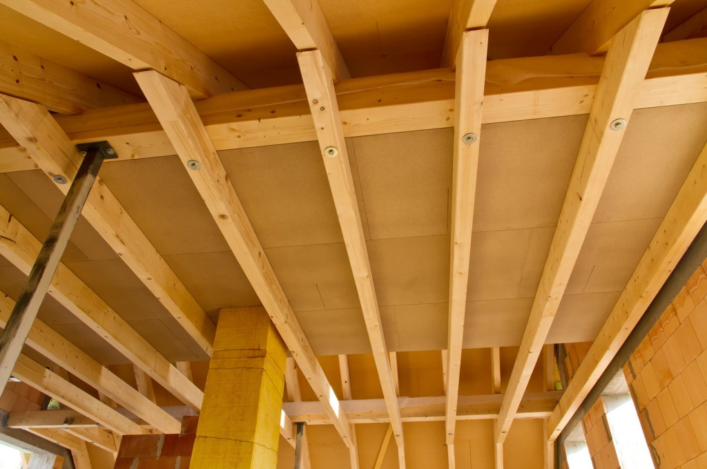 Attic flooring in a house built of vulture panels can be made using the same technology or in the form of a familiar wooden frame. The second option is better in sound-insulating qualities, and panels - in keeping heat. Beams are produced from massive timber, dried in special chambers, which is then cut to the nominal size with modern equipment. It is desirable that parts of the ceiling should be delivered to the construction site already cut according to the project.