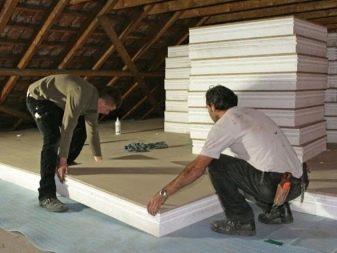 Laying hard insulation is quite simple. First you need to level the base, remove unevenness, drops on the floor. Put the cement-sand screed. Sheets are stacked between the bars. If no one lives in the attic, then the insulation must be closed with plastic film. And if the floor will be operated, then OSB must be put on the foam plastic or it must be poured with cement mortar.