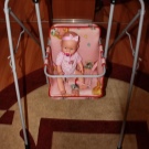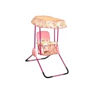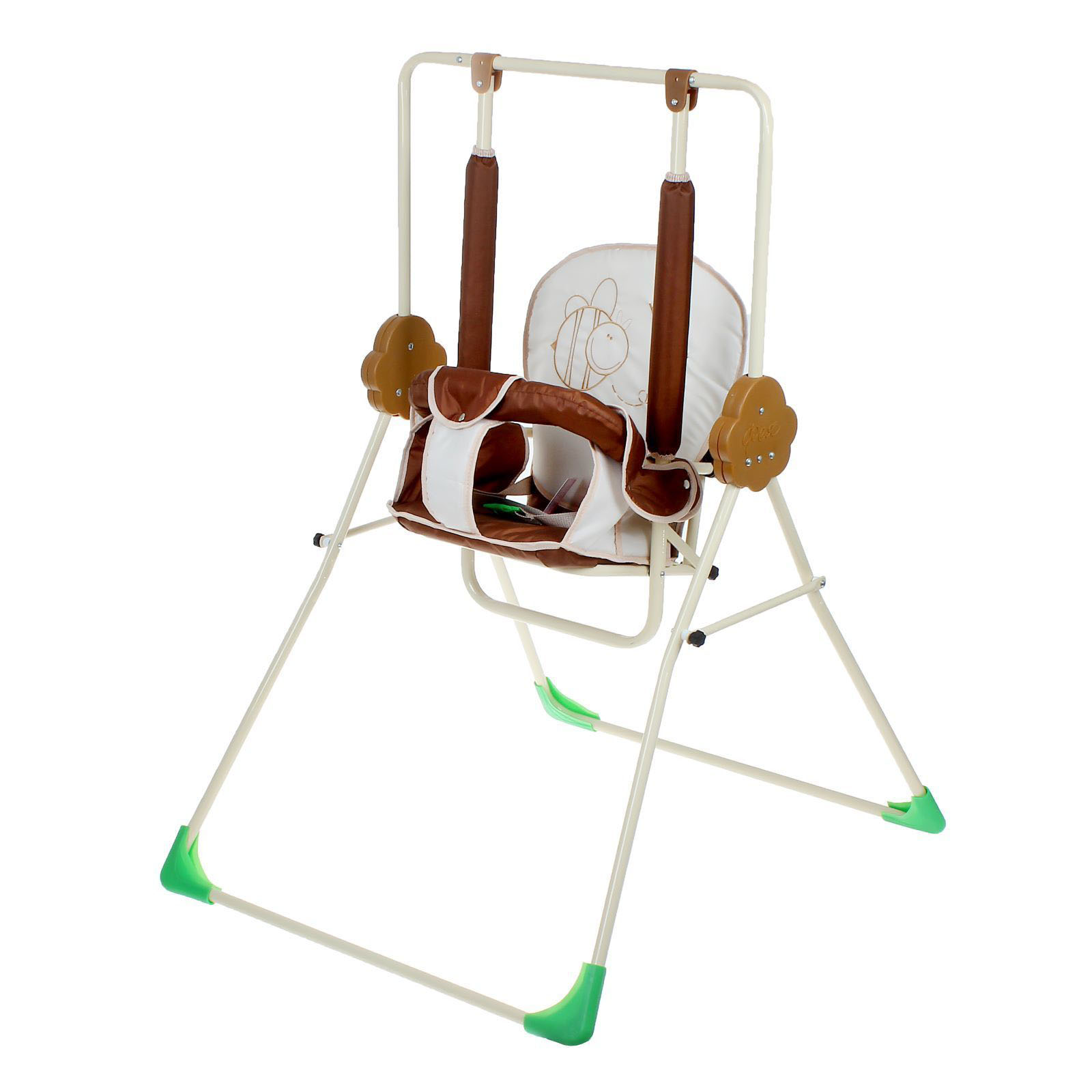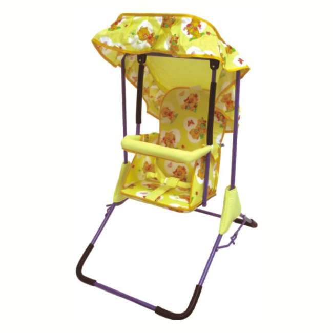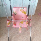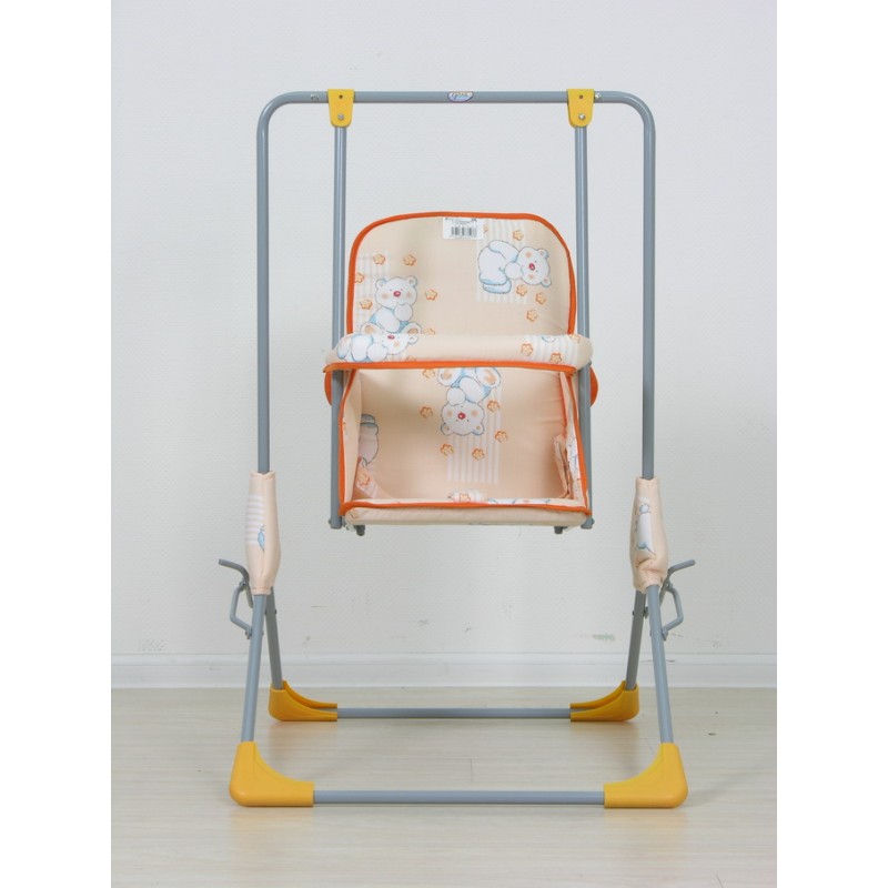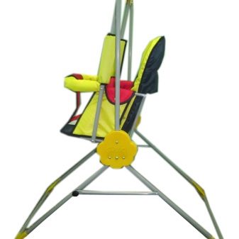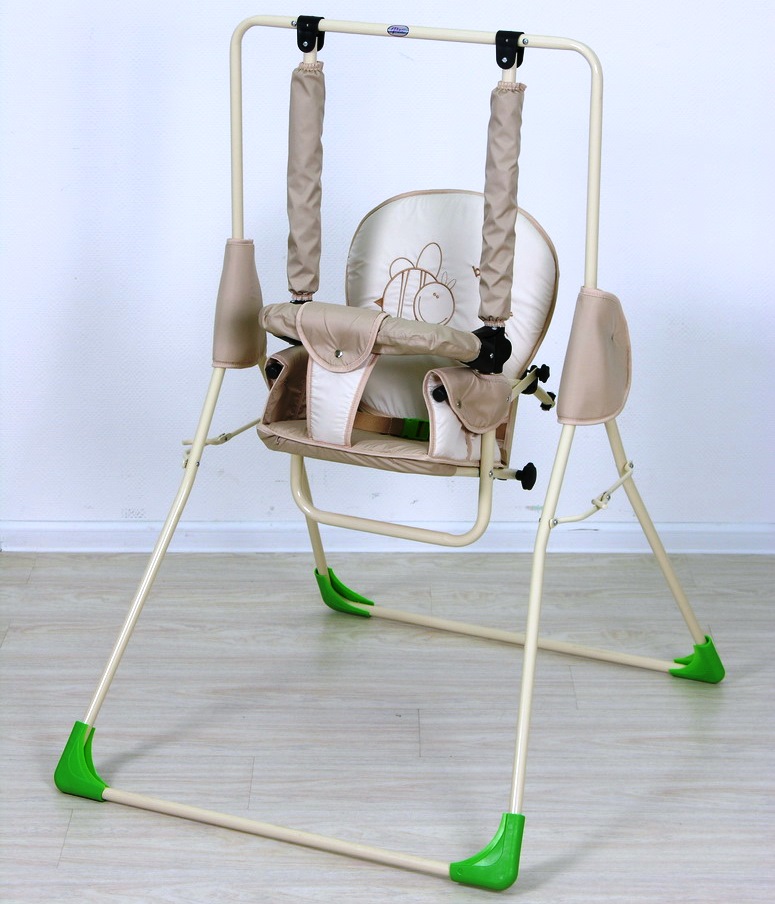 - With and without tent. For greater convenience of the child, seat belts have soft lining, and so that the baby does not fall out, the seat is equipped with a restrictive handrail, which can be removed if necessary. The mechanism of folding swings - the type of "books". With a relatively small weight - only 6 kg - the swing can withstand a child up to 15 kg.
