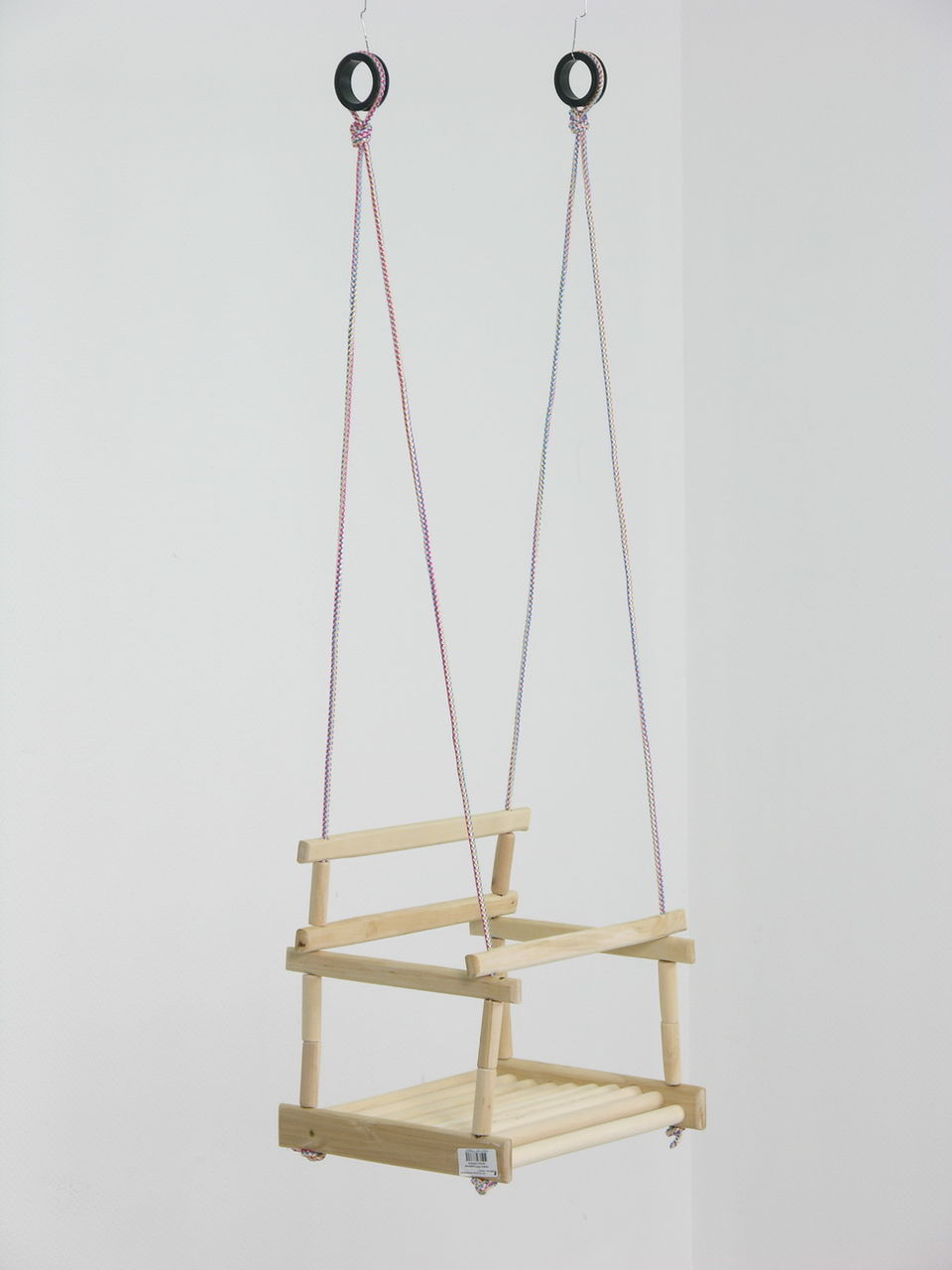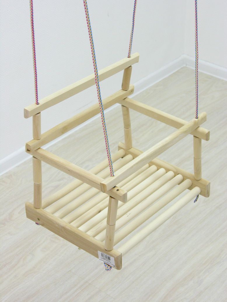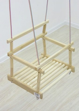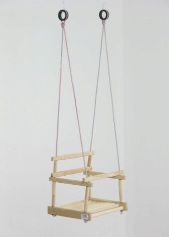 - The easiest and since childhood all familiar version of the swing swing - it is with a wooden seat and with lifting restrictive rails. Holds such a design on a heavy-duty cable, reinforced with metal rings. This model is designed for children up to 10 years old weighing up to 30 kg.