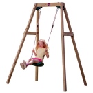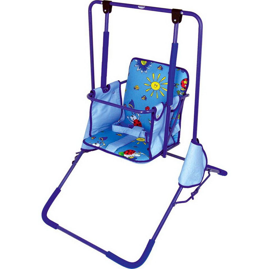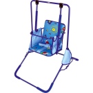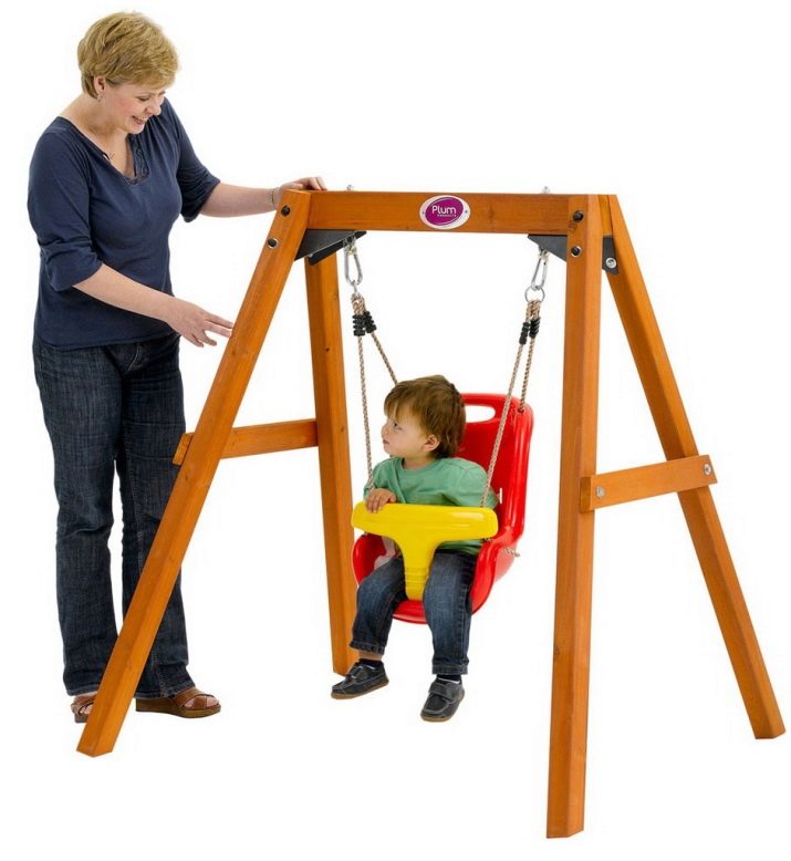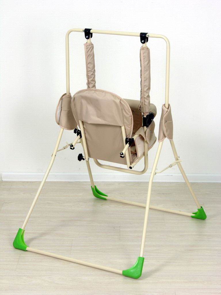 - Swing with a robust frame. Usually, a metal base in the form of hollow tubes is used as a framework. Most modern models are a combination of metal and durable plastic. Some elements of construction are equipped with wooden elements. This adds to the attractiveness of the design. The legs of the frame should be made of durable materials and fitted with rubber pads and suction cups for secure fixing. The elements of the frame (for example, in the places for which the baby keeps) should be covered with fabric material or rubberized to avoid slipping. Numerous clamps protect against injury when swinging.