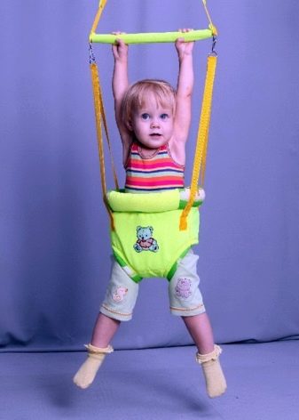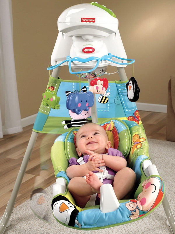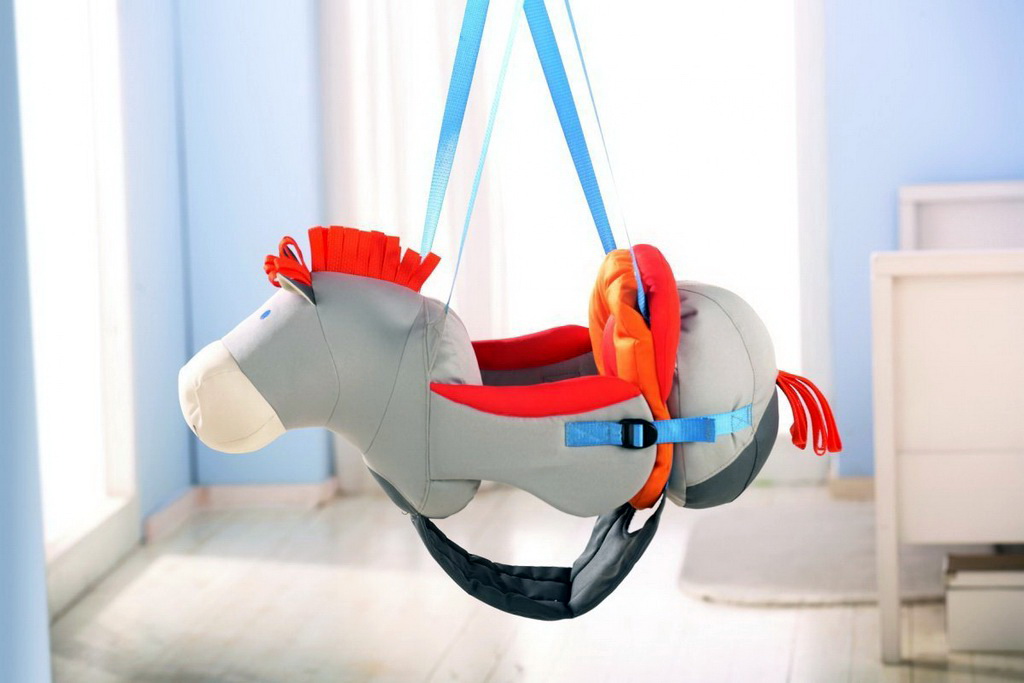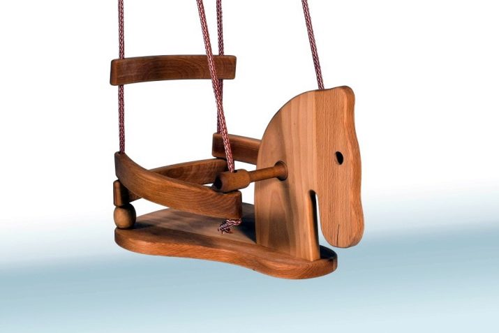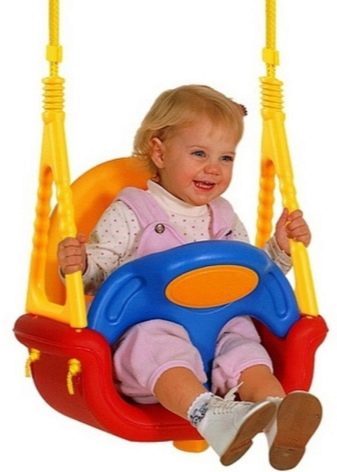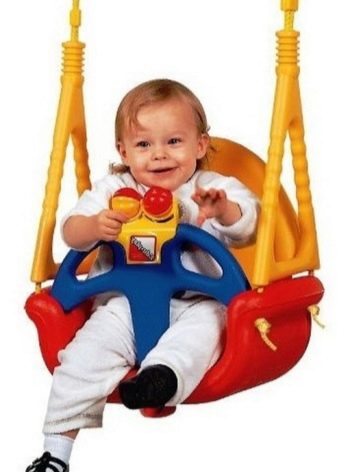 Of particular note is a kind of swing, which is equipped with children's educational toys. They have a beneficial effect on the child and contribute to the concentration of attention. Usually, toys are placed on the handles of a swing or on a removable table, from which, if desired, you can easily get rid of.