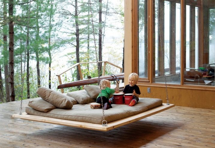 Wooden suspended swing for home are most popular because they are the most reliable among all varieties of this device. Such a swing can even be carried out in the summer and installed on the street, for example, in the country or in the yard. In addition, wooden swings are easy to disassemble and fold, and therefore they will not take up much space. It is convenient to wash and disassemble them.