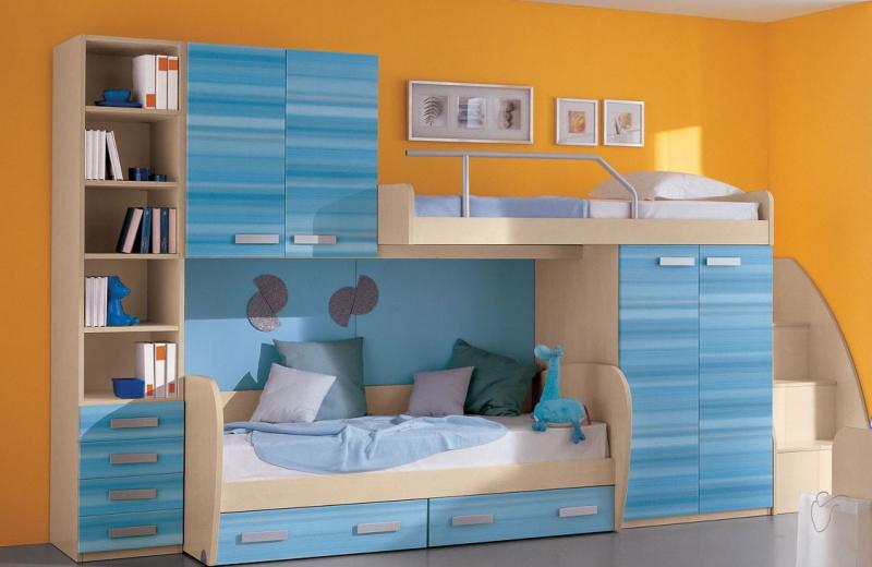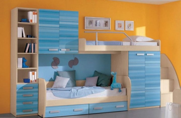 There are several types of such beds. It can be a classic bunk bed when the beds are under each other. Or a bed with a displaced or retractable bed. Whatever the bunk bed, its stairs should be comfortable, not cause concern and well fastened.