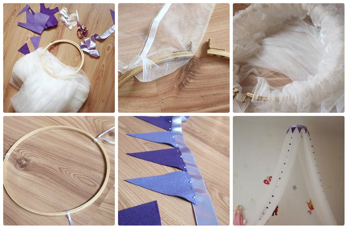 Collect all the curtains on the hoop, fasten them with a needle and thread, decorate with ribbons along the edges. Fasten the hook over the place where the bed will be. Hang the frame on the hook. Done!