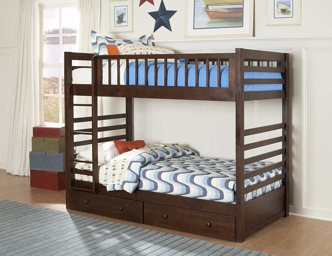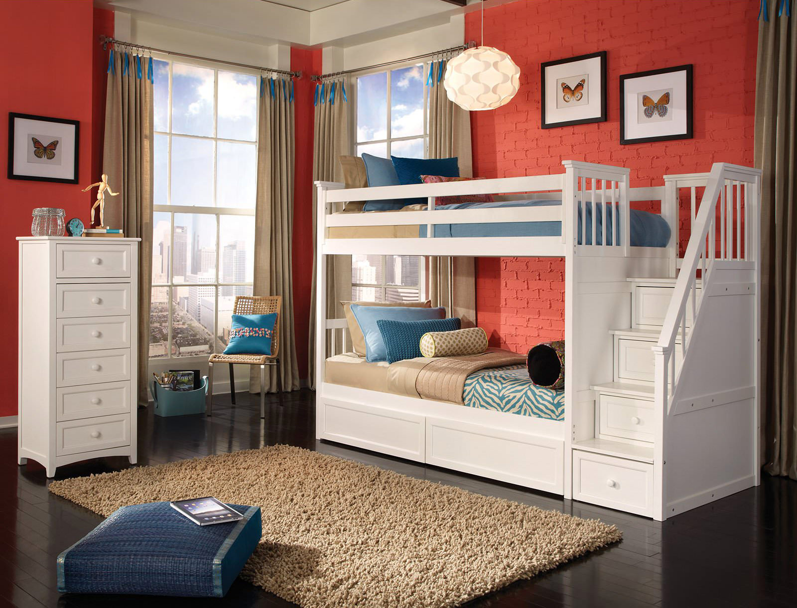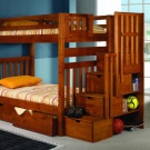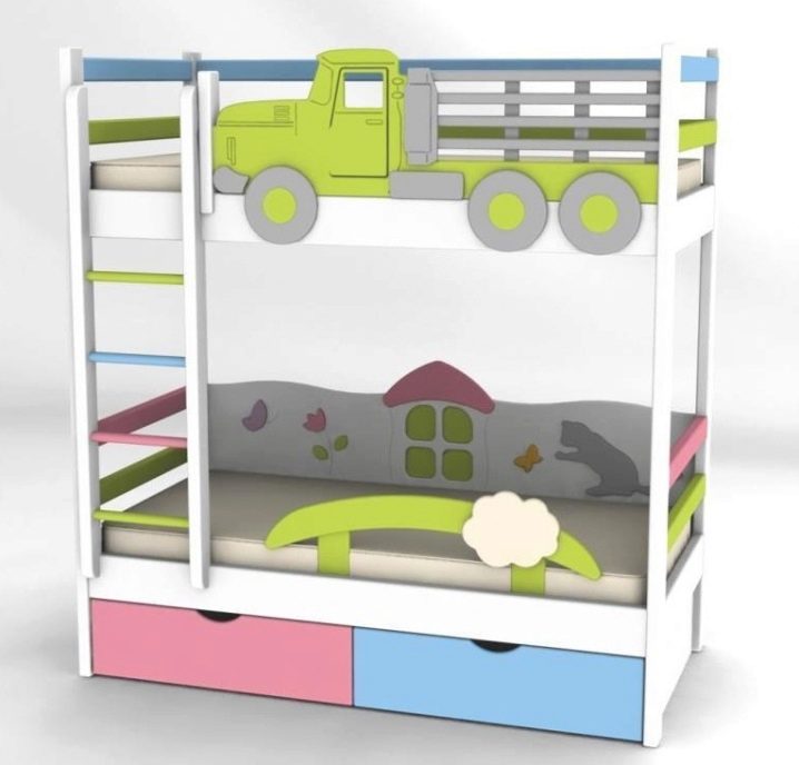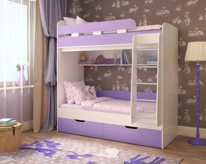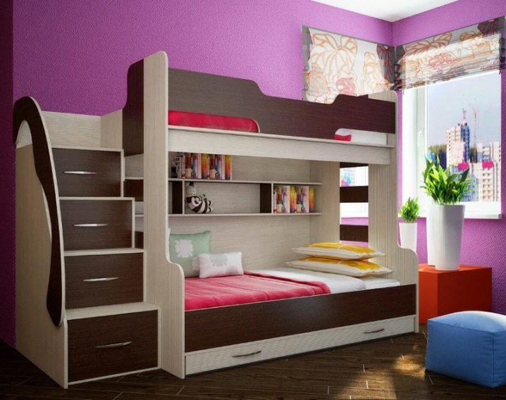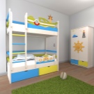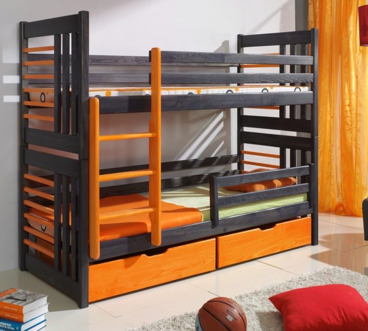 Ordinary bunk beds, where one bed is located under the other.On the second floor there is a staircase either from the rails, or with steps, or a staircase with built-in drawers.