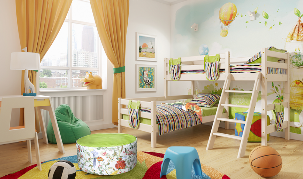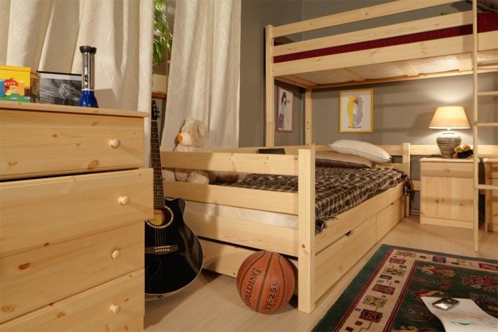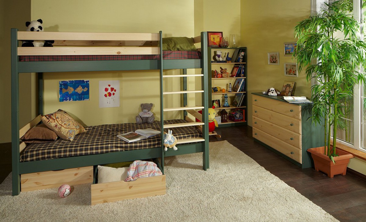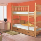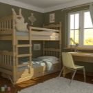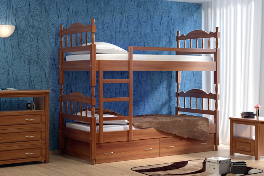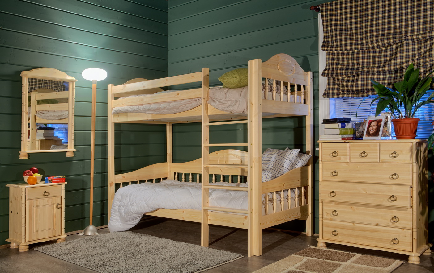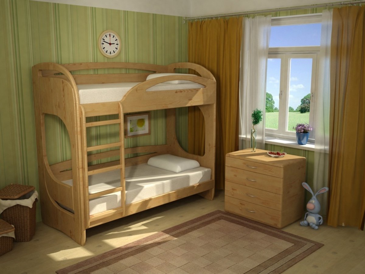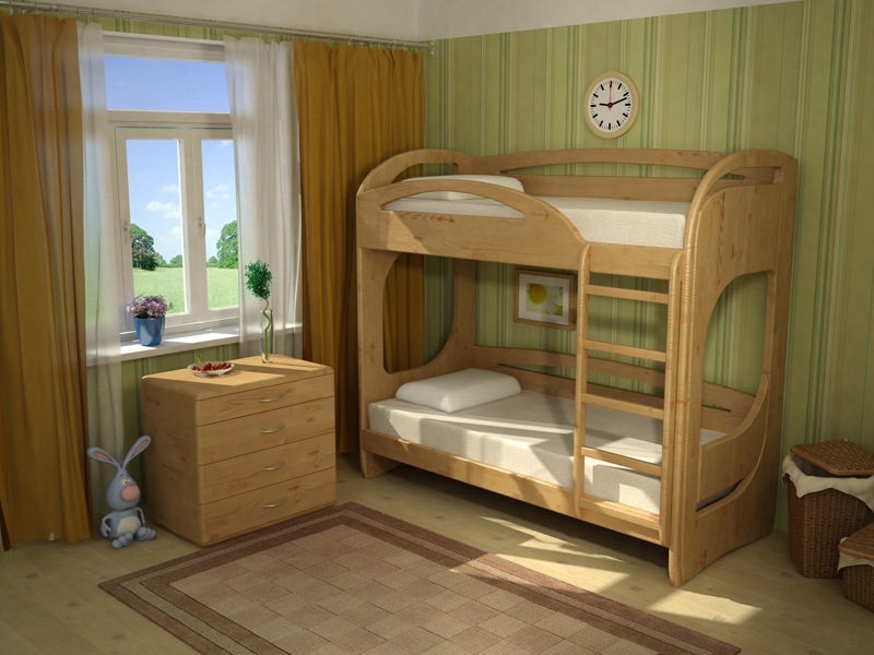 The advantage of a bed made of solid wood is its environmental friendliness. Traditional materials for the manufacture of furniture can reduce the final cost, bringing the basic model of a wooden bunk bed closer to the average model of a bed made of PVC or chipboard.At the same time, solid wood does not emit ethanol when heated, so the bed can be installed next to heating devices or central heating pipes.