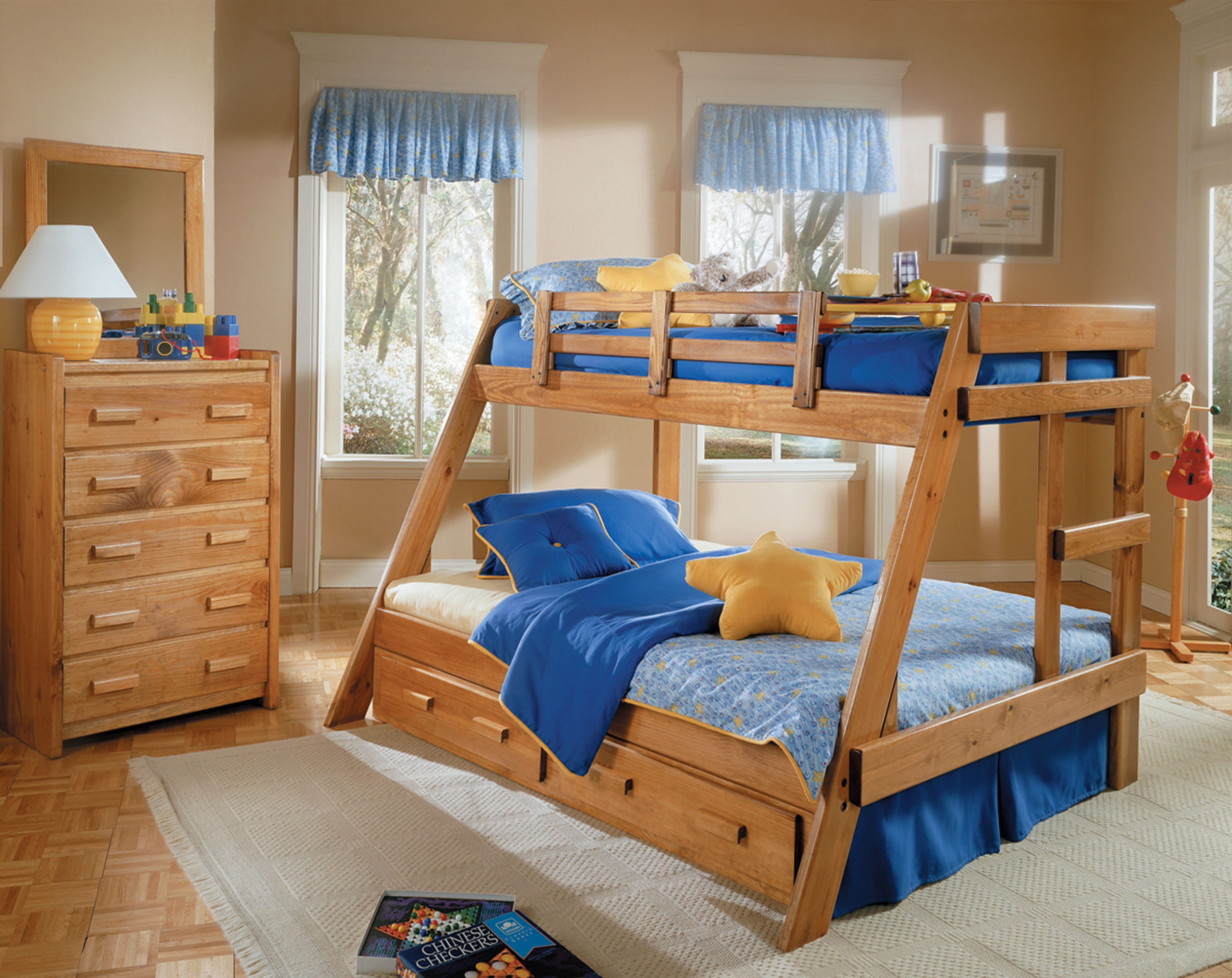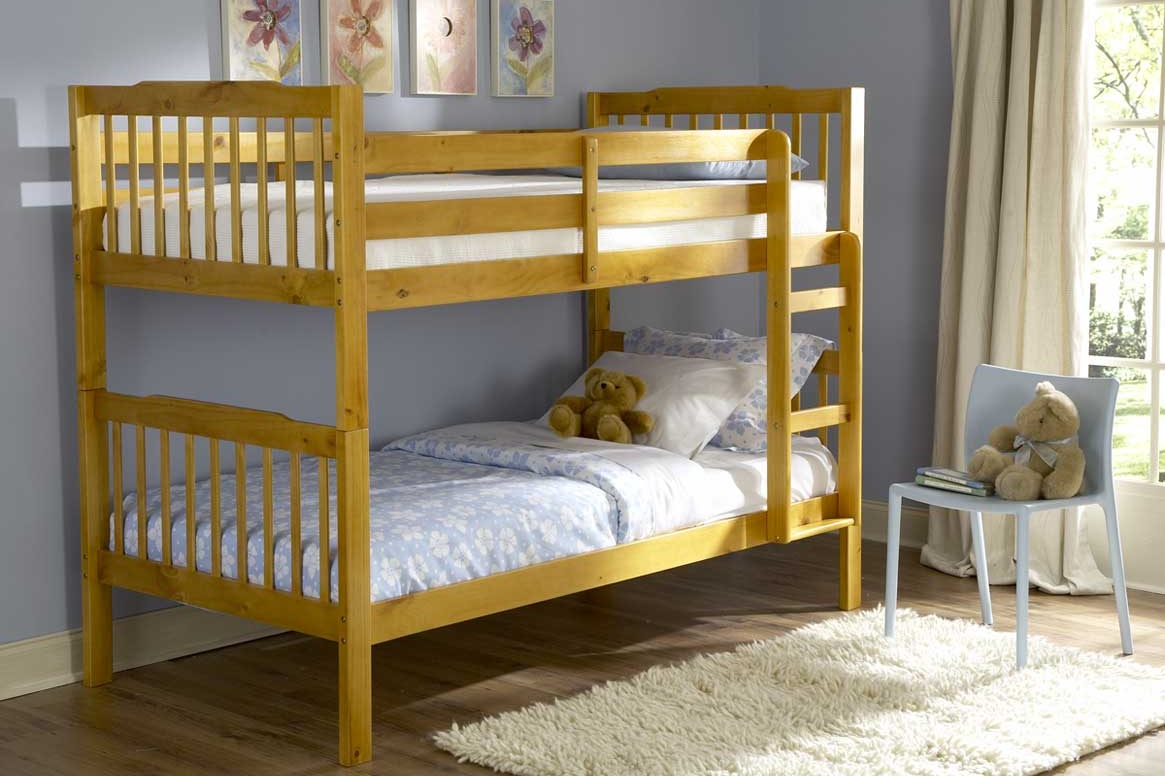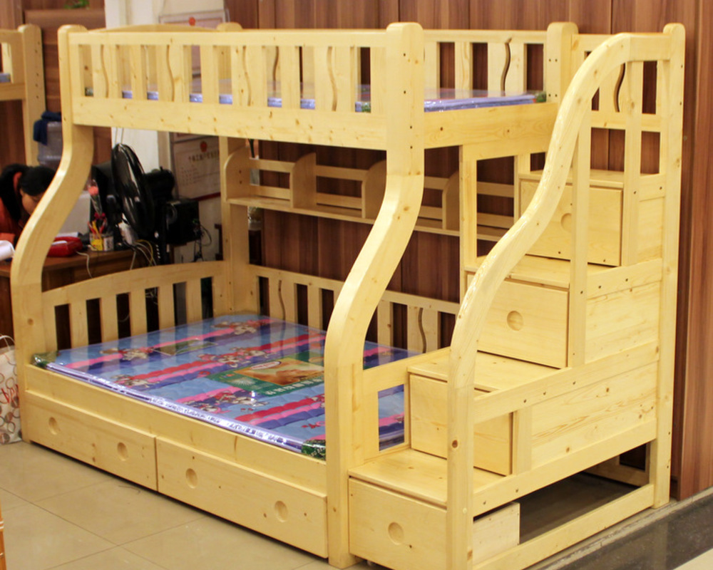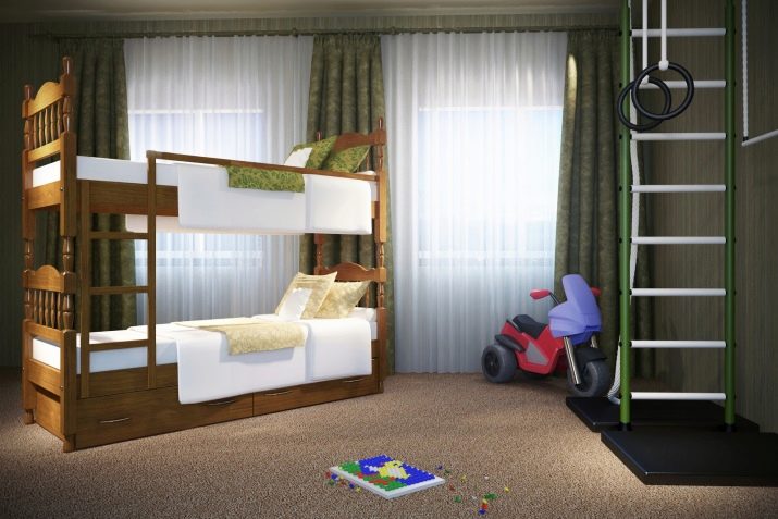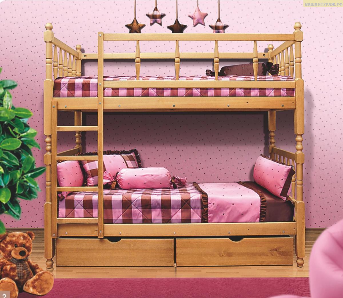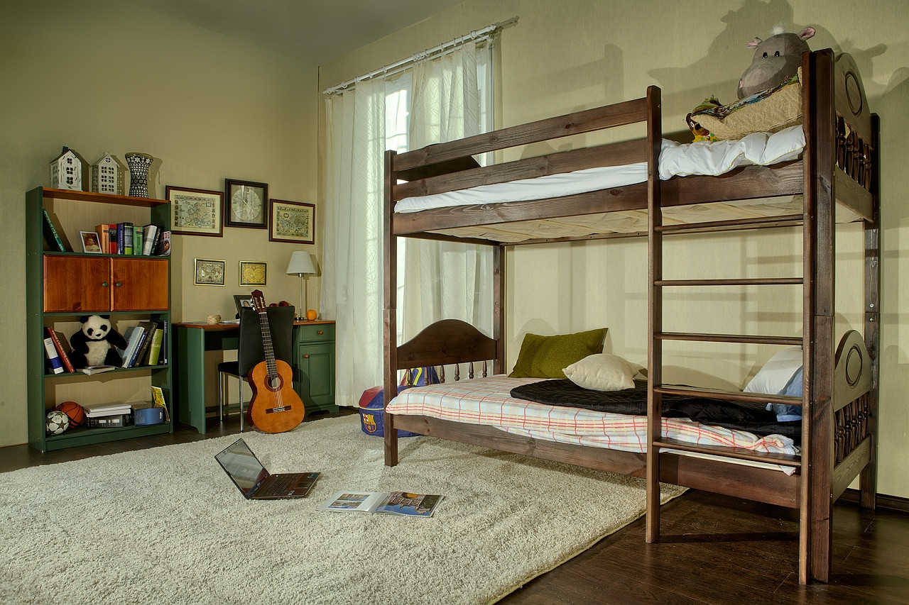 The advantage of a bed made of solid wood is its environmental friendliness. Traditional materials for the manufacture of furniture can reduce the final cost, bringing the basic model of a wooden bunk bed closer to the average model of a bed made of PVC or chipboard.At the same time, solid wood does not emit ethanol when heated, so the bed can be installed next to heating devices or central heating pipes.