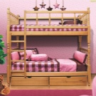 Dreamline has two models of bunk beds: Junior-1 and Junior-2. They differ in the material of the frame, the first is made of solid ash, the second of the beech. Each bed is completed with two berths with a basis on lamels and two drawers in the basis of the lower tier. The array can be covered with veneer pear and walnut patina, as well as imitate the texture of any tree. Height of a bed is 190 cm.
