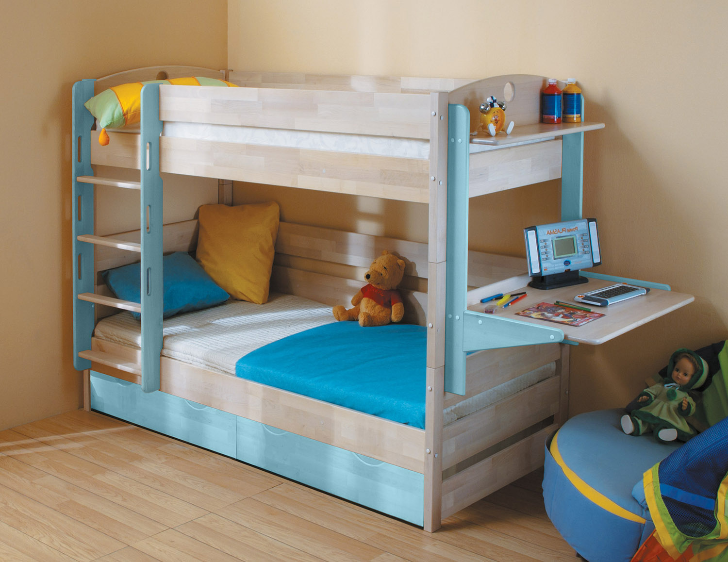 Another brand - Woodmaster, produces original designer wooden beds. Their catalog contains cot-beds, sports beds, beds in which the upper tier imitates the deck of a sailing ship, and the lower submarine. All frames are very durable, have a hypoallergenic coating. Transforming beds are quite popular in which the lower tier is moved apart and forms a dining or working area: two sofas and a table between them.