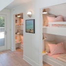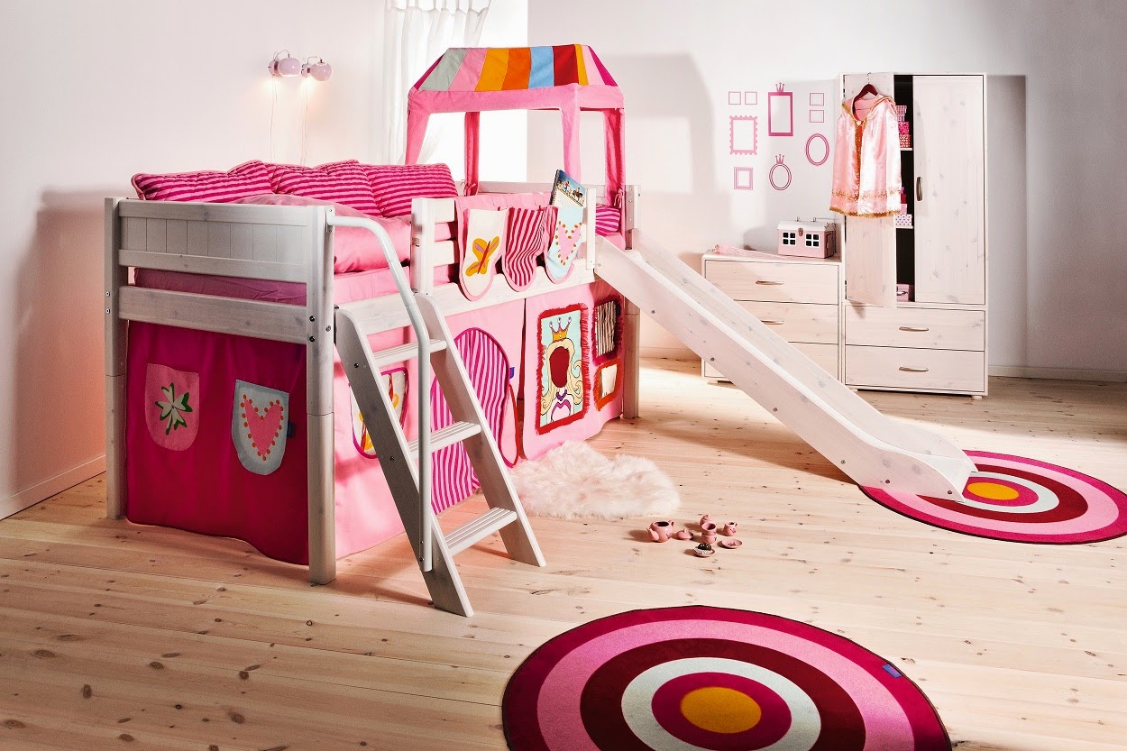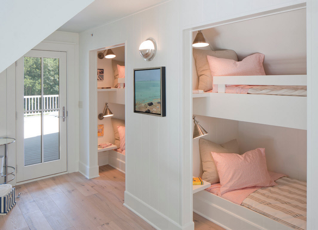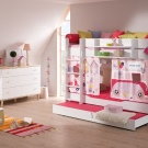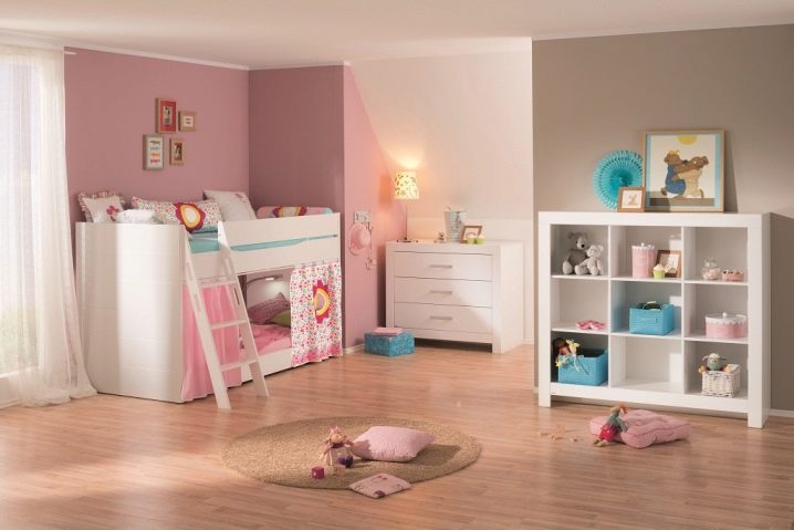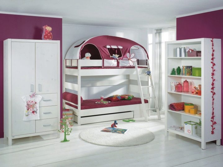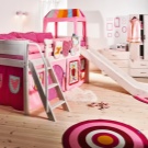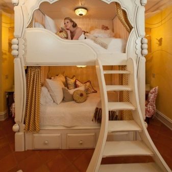 Bunk beds can also be selected by gender. For girls, the decoration and decor can be in pink, coral, beige. You can also choose a girlish design. Here, this type of beds is presented in the form of houses, beds of princesses, all kinds of castles.