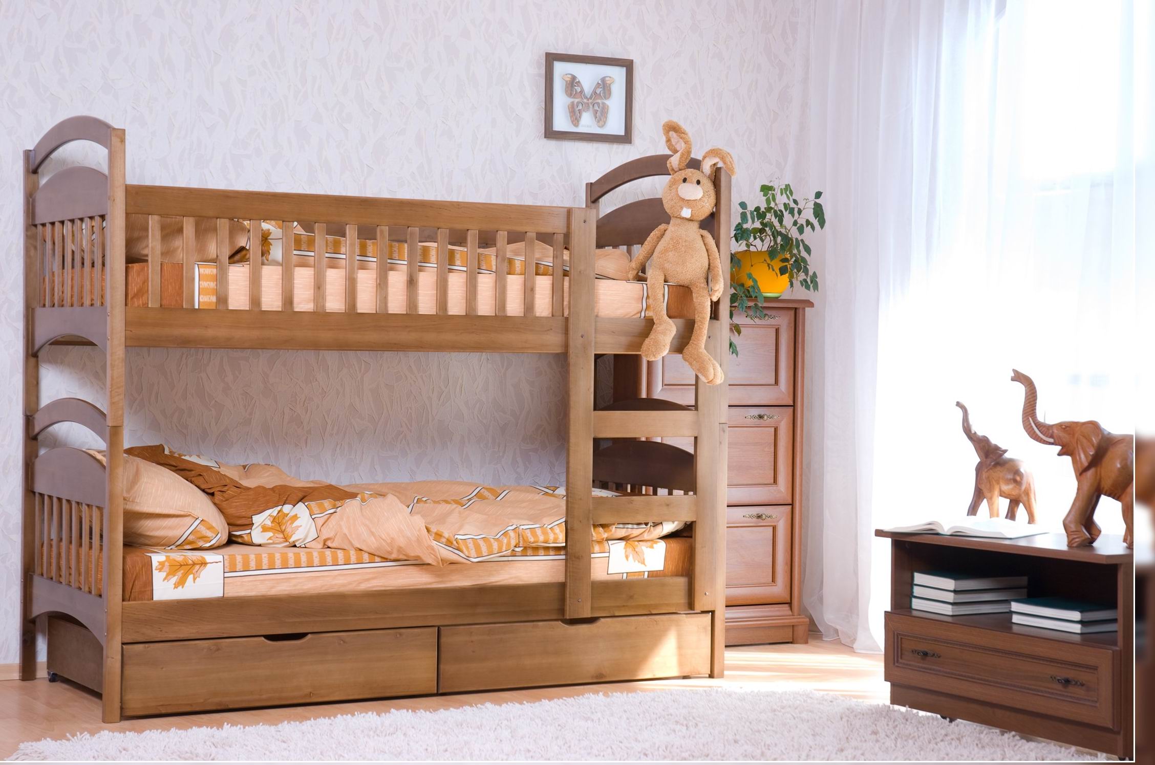 Bed made of solid wood. The most suitable material for bunk beds is warm, solid, and will last for many years. It is mainly made of two types of wood - pine and oak. The latter is more preferable, since its wood is much stronger and more durable than the first.