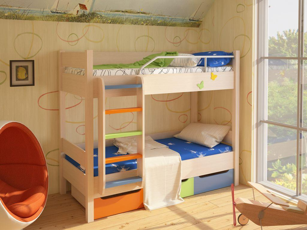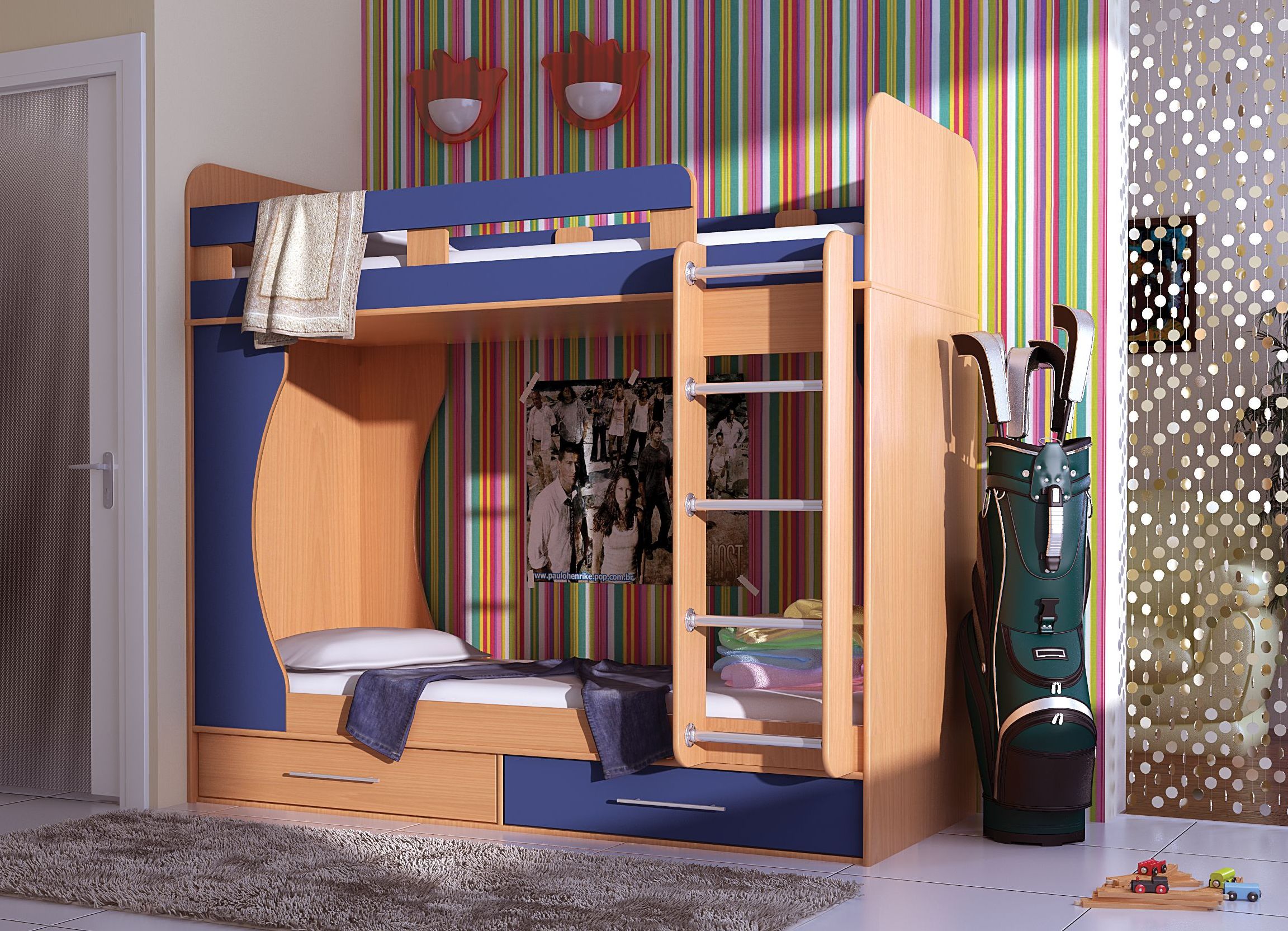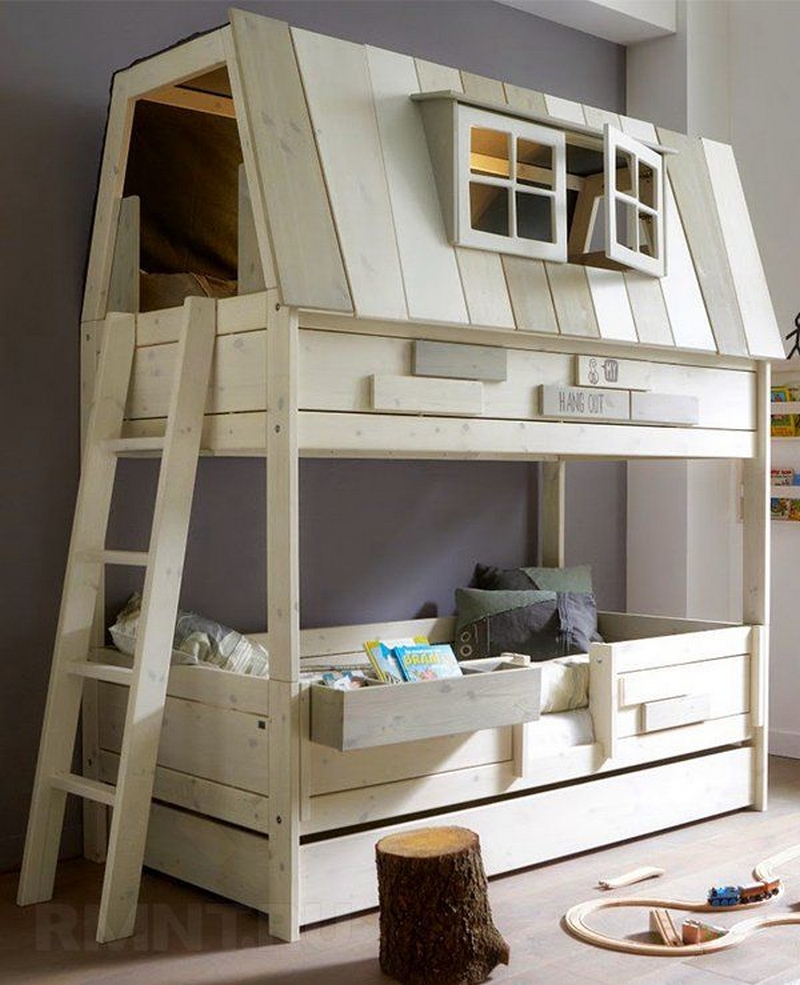 Classic duplex beds. They are the usual two beds, one above the other, where a ladder goes to the upper level, located either sloping or vertically.Conveniently, if such a bed is equipped with drawers for storing things or bedding.