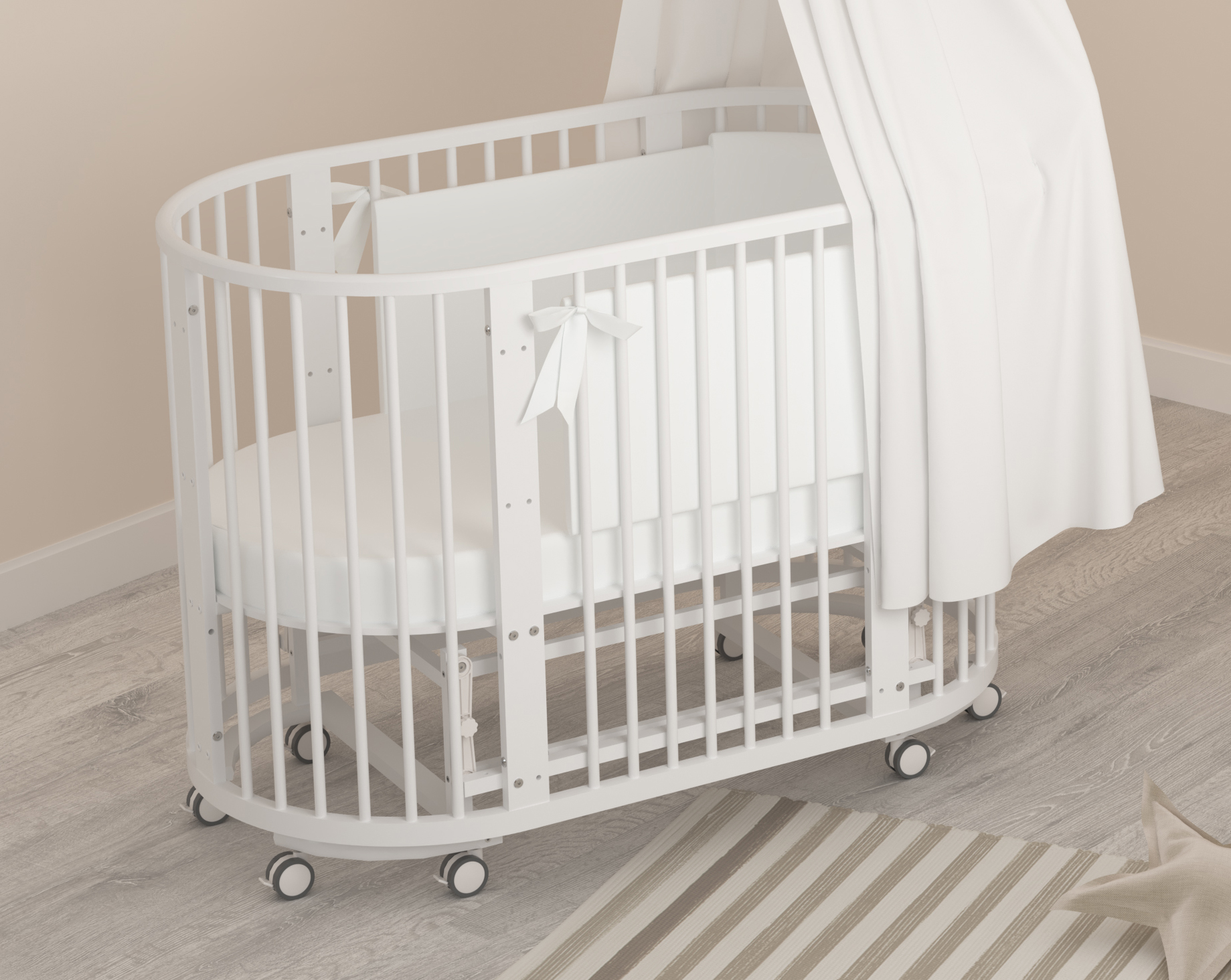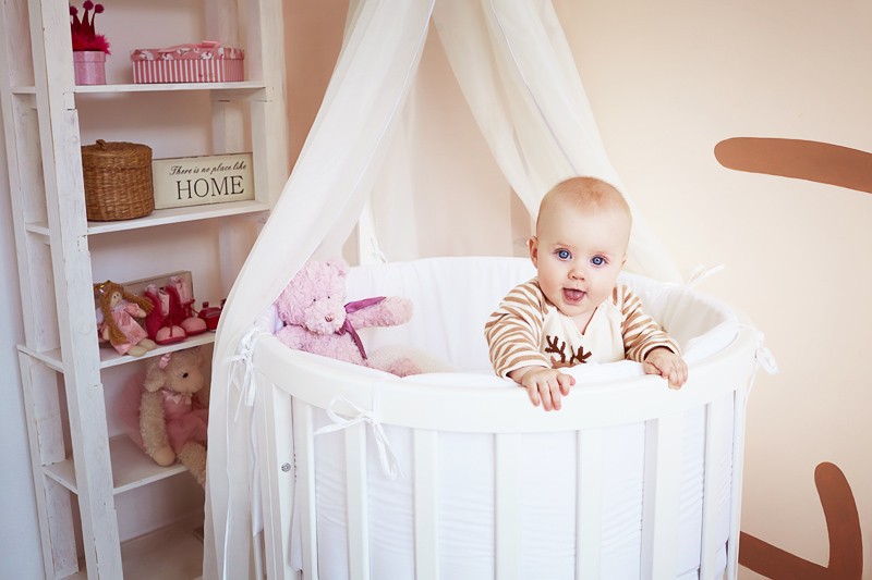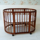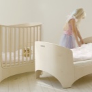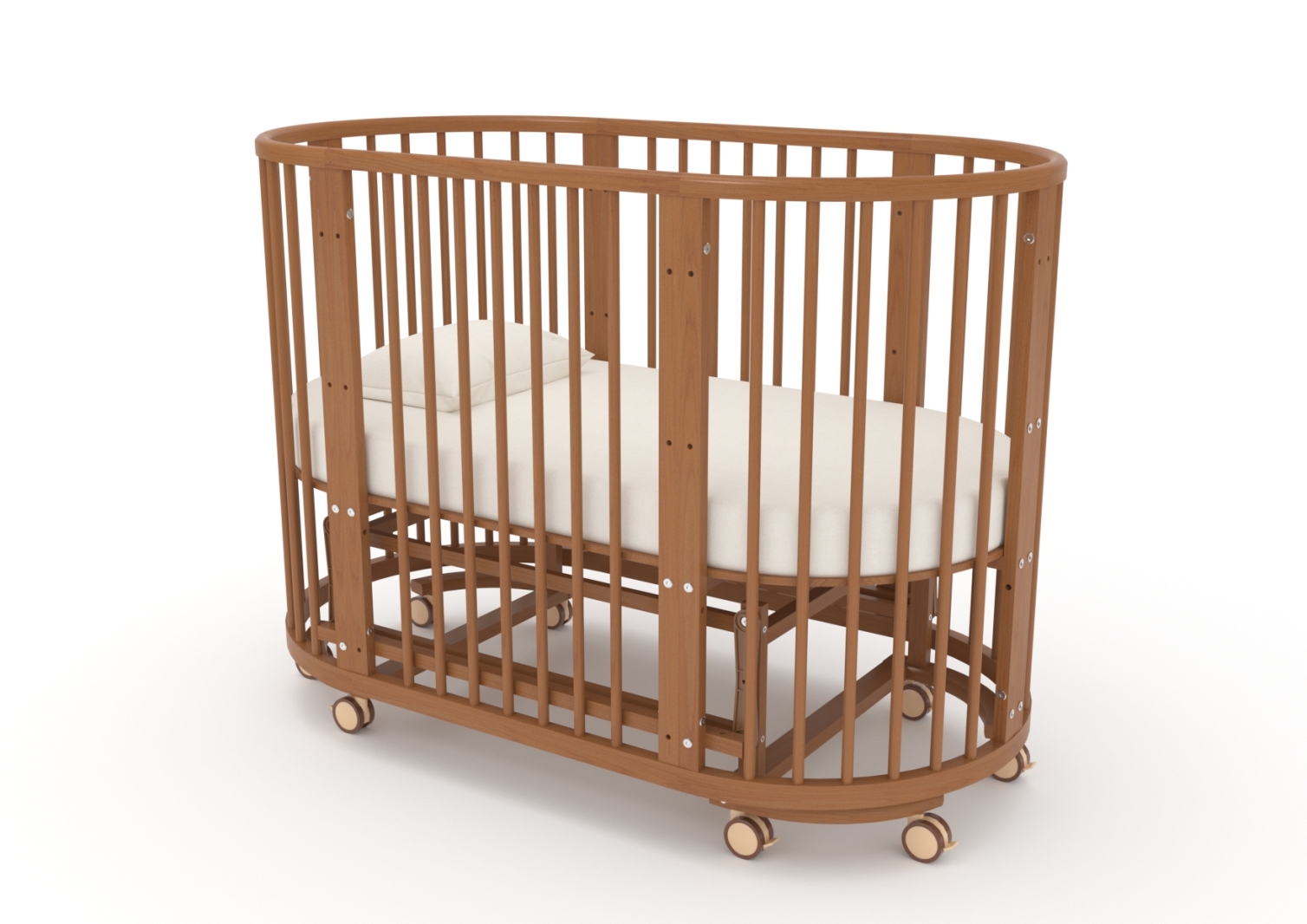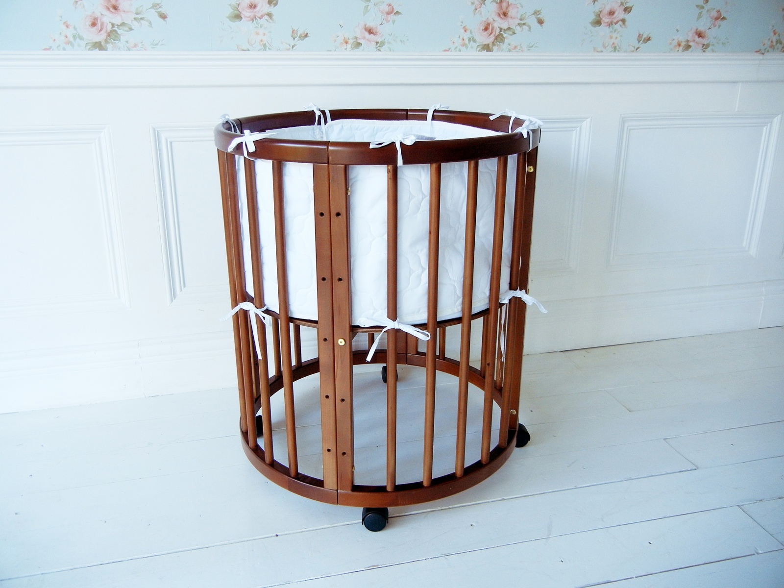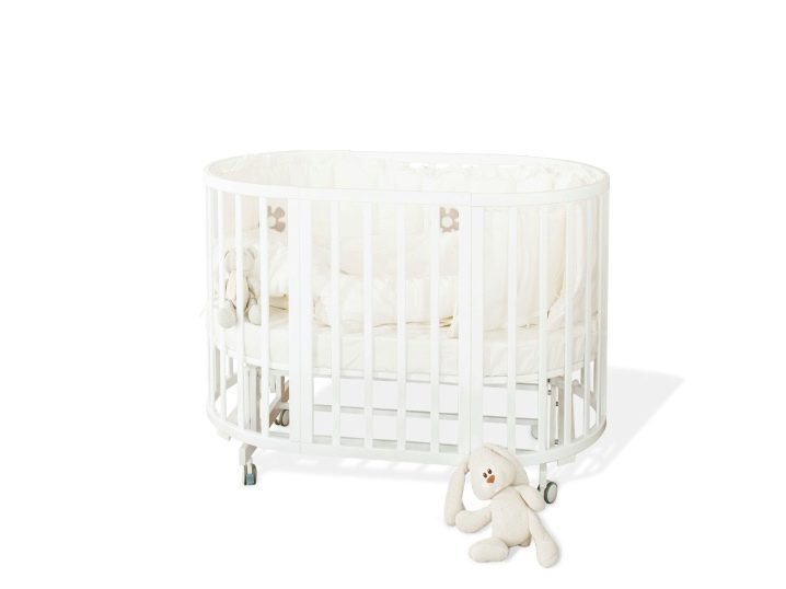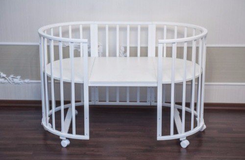 Initially, the bed is used as a neat round crib on the wheels, where the child is very comfortable to sleep, and the bed itself takes up a minimum of space. When the baby grows up, the cradle can be transformed into a full oval-shaped crib, and later, during the period of activity and attempts to stand up, lower a little the level of a berth. Some models have adjustable sides, which makes it much easier for parents to take care of a child, especially at night.