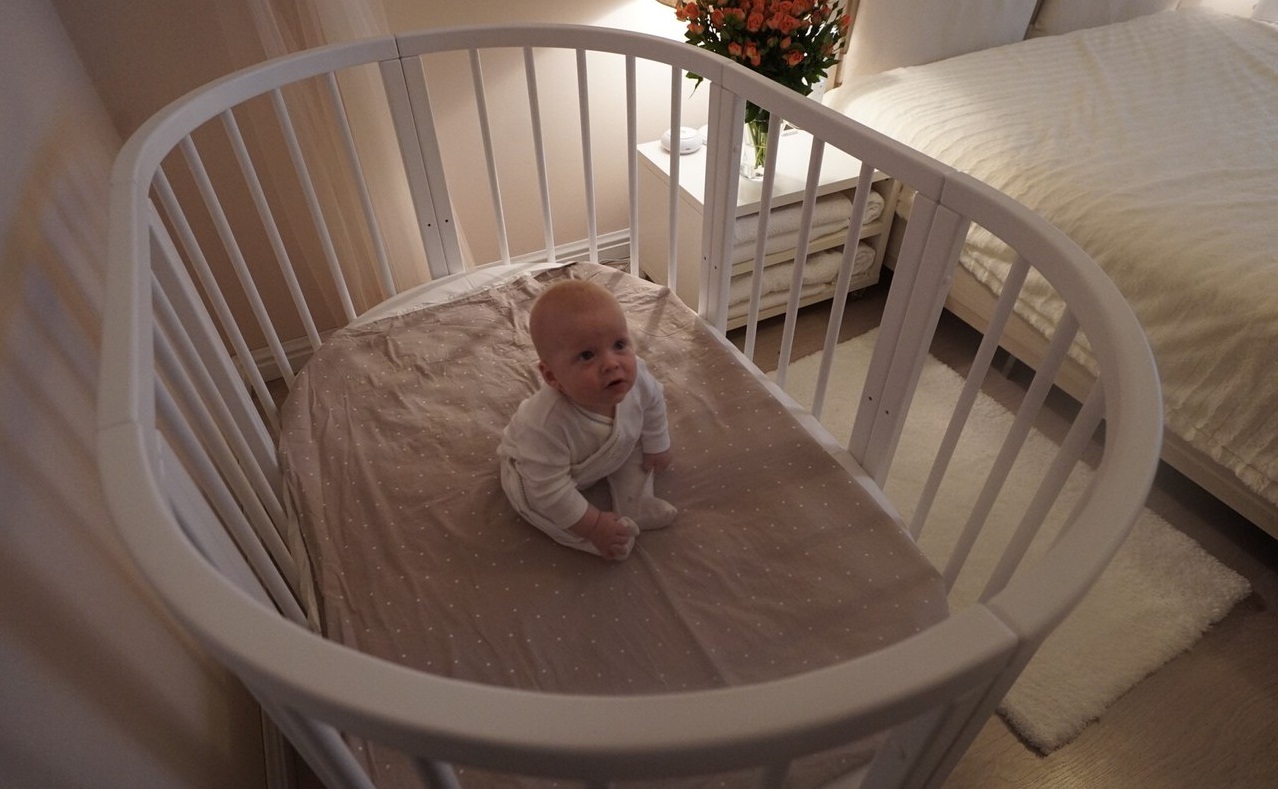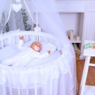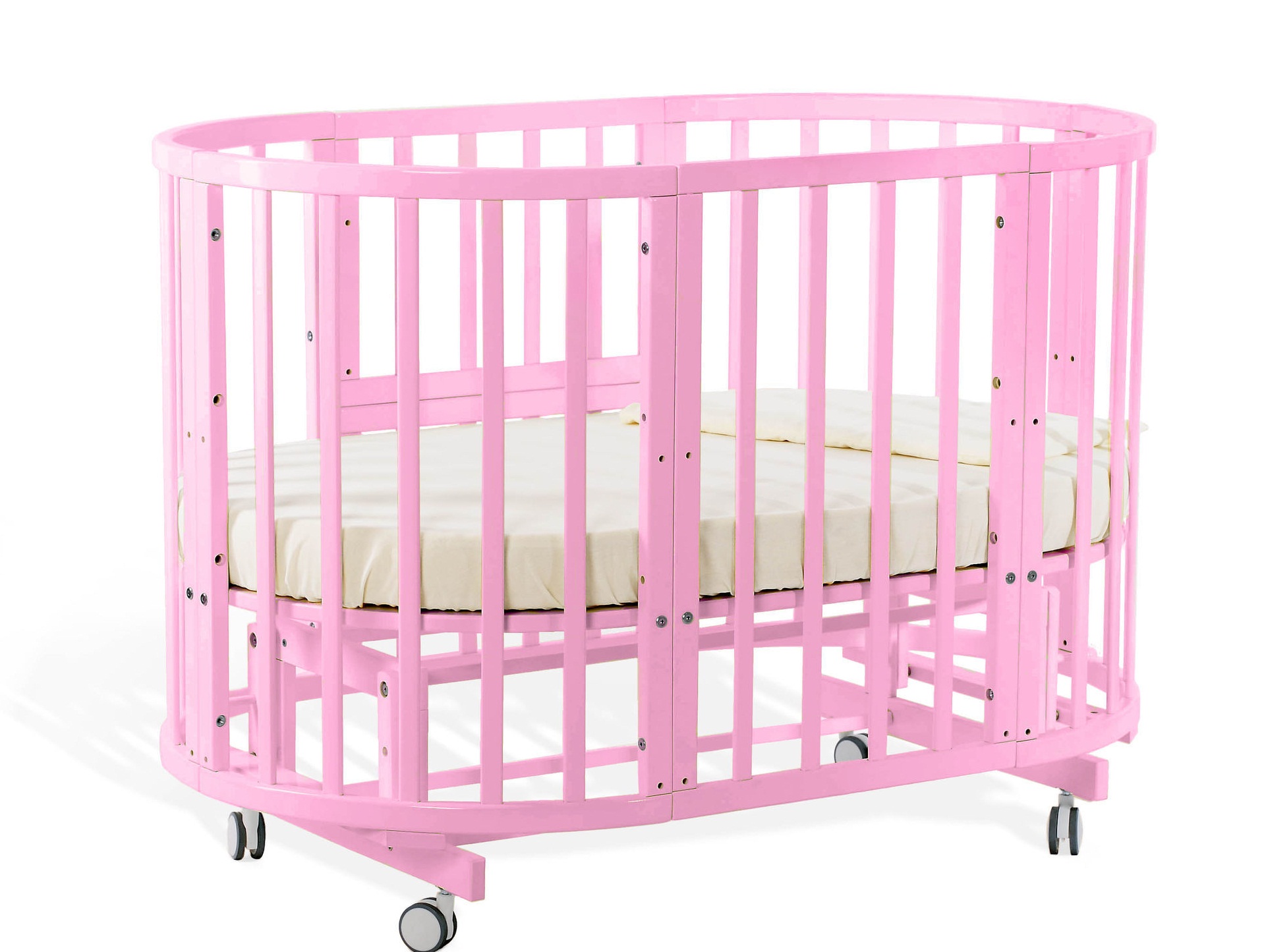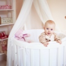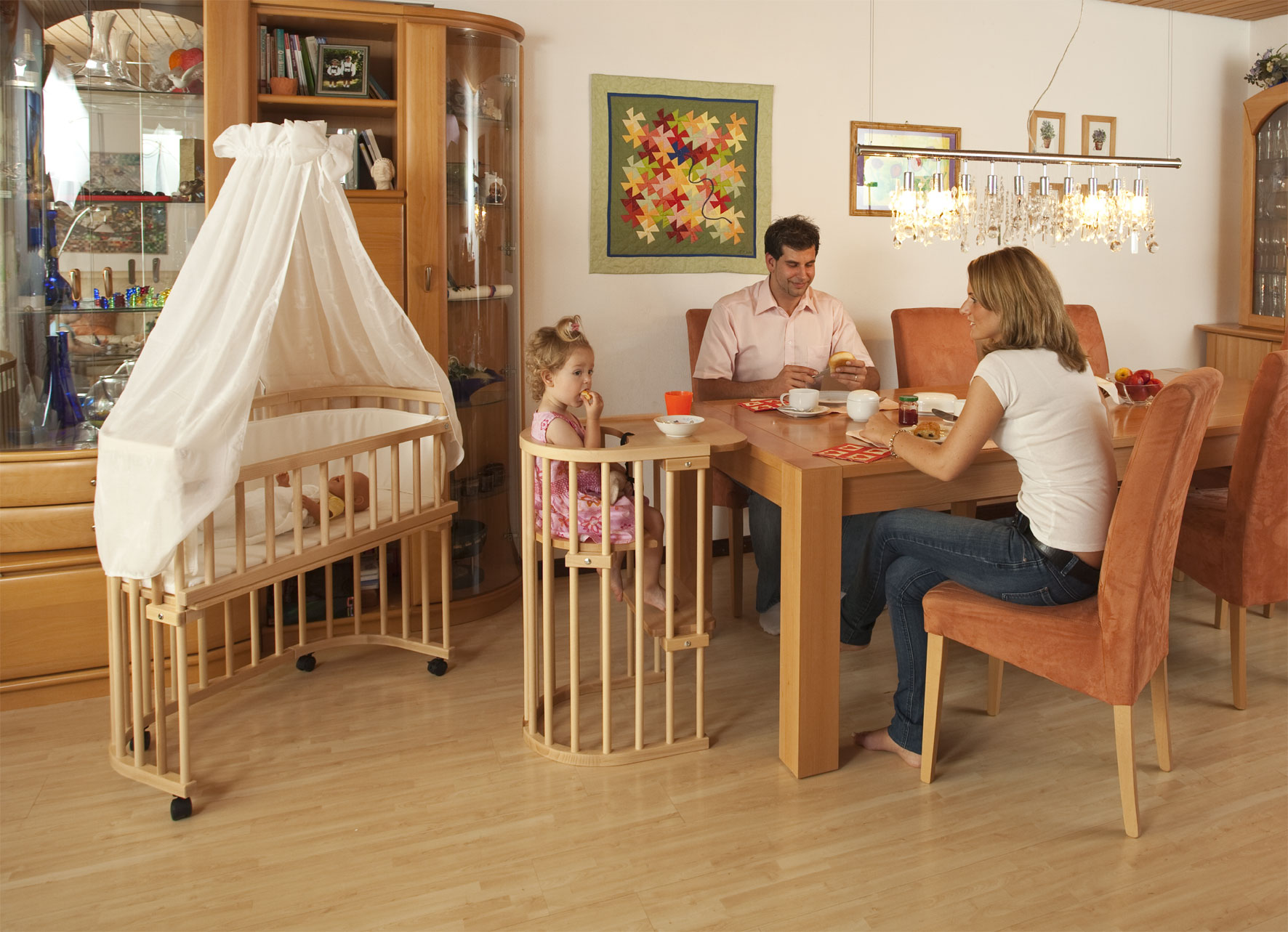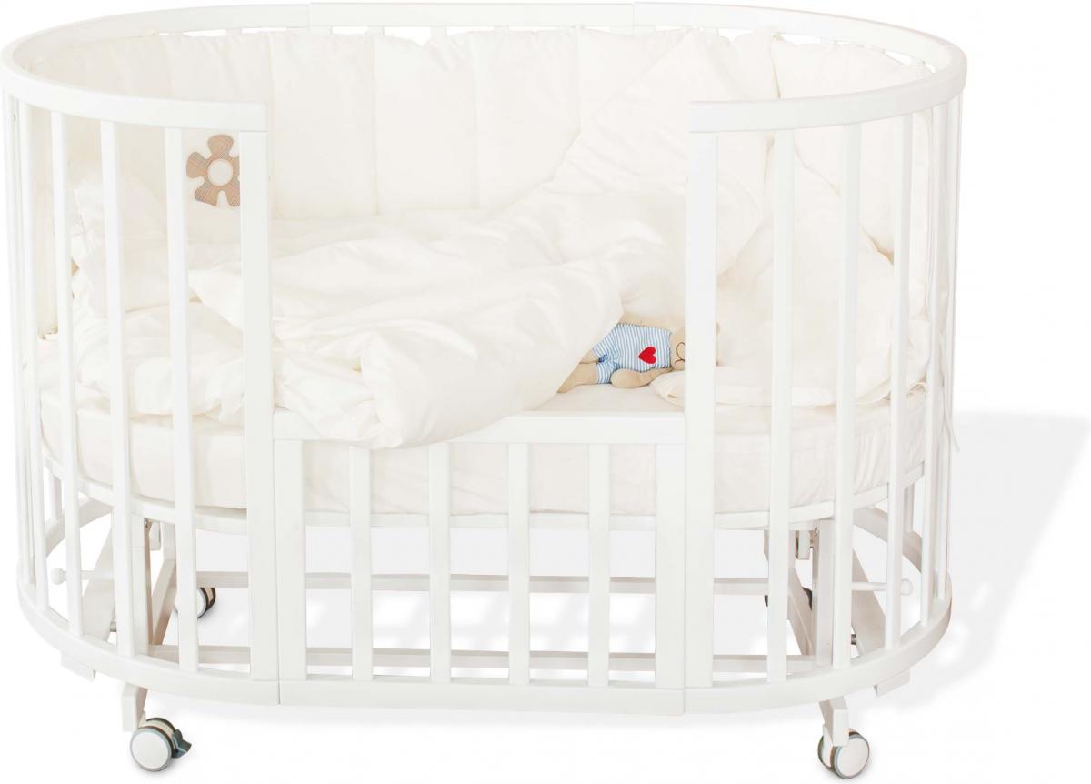 Initially, the bed is used as a neat round crib on the wheels, where the child is very comfortable to sleep, and the bed itself takes up a minimum of space. When the baby grows up, the cradle can be transformed into a full oval-shaped crib, and later, during the period of activity and attempts to stand up, lower a little the level of a berth. Some models have adjustable sides, which makes it much easier for parents to take care of a child, especially at night.