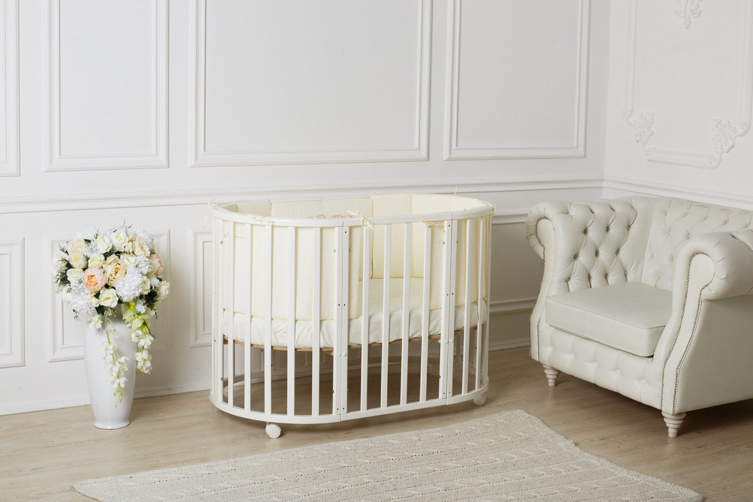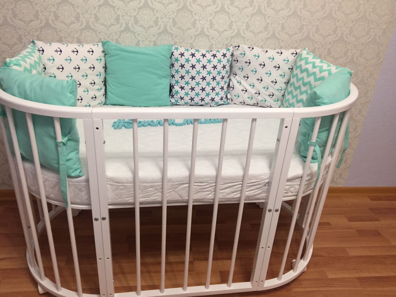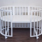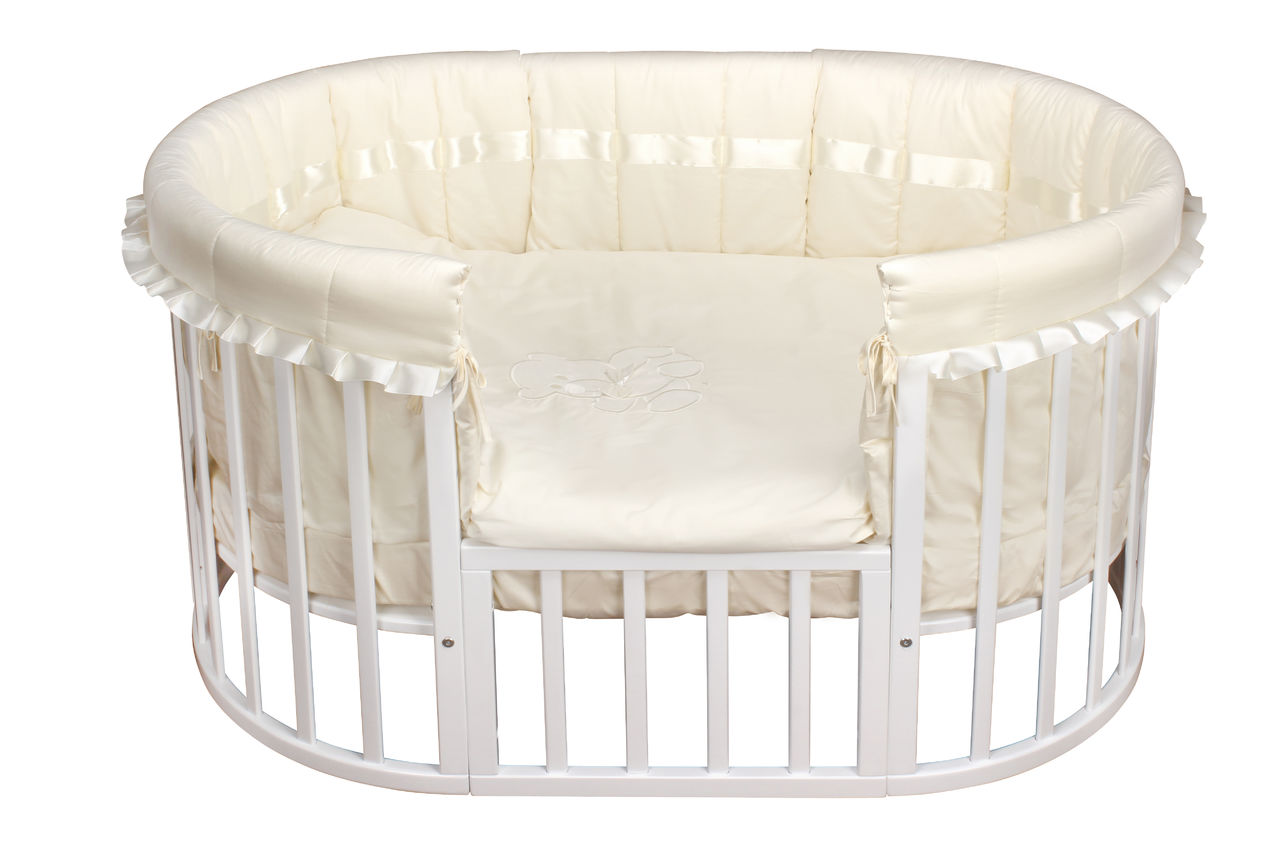 When buying such an original crib as an oval transformer, additional accessories should be appropriate not only in appearance but also in form. First of all it concerns a mattress that comes with a bed, sometimes for an additional price. As a rule, oval transforming beds have two types of completing mattresses. The first is available in two sizes at once: round for a cradle and a large oval for a full bed. The second option has three parts, which are distributed as follows: two smaller halves are in semicircular parts, which together form the cradle, and separately soft armchair, and in the middle is the third part of a rectangular shape, added during the conversion of the cradle into a large bed.