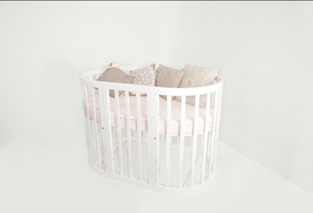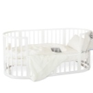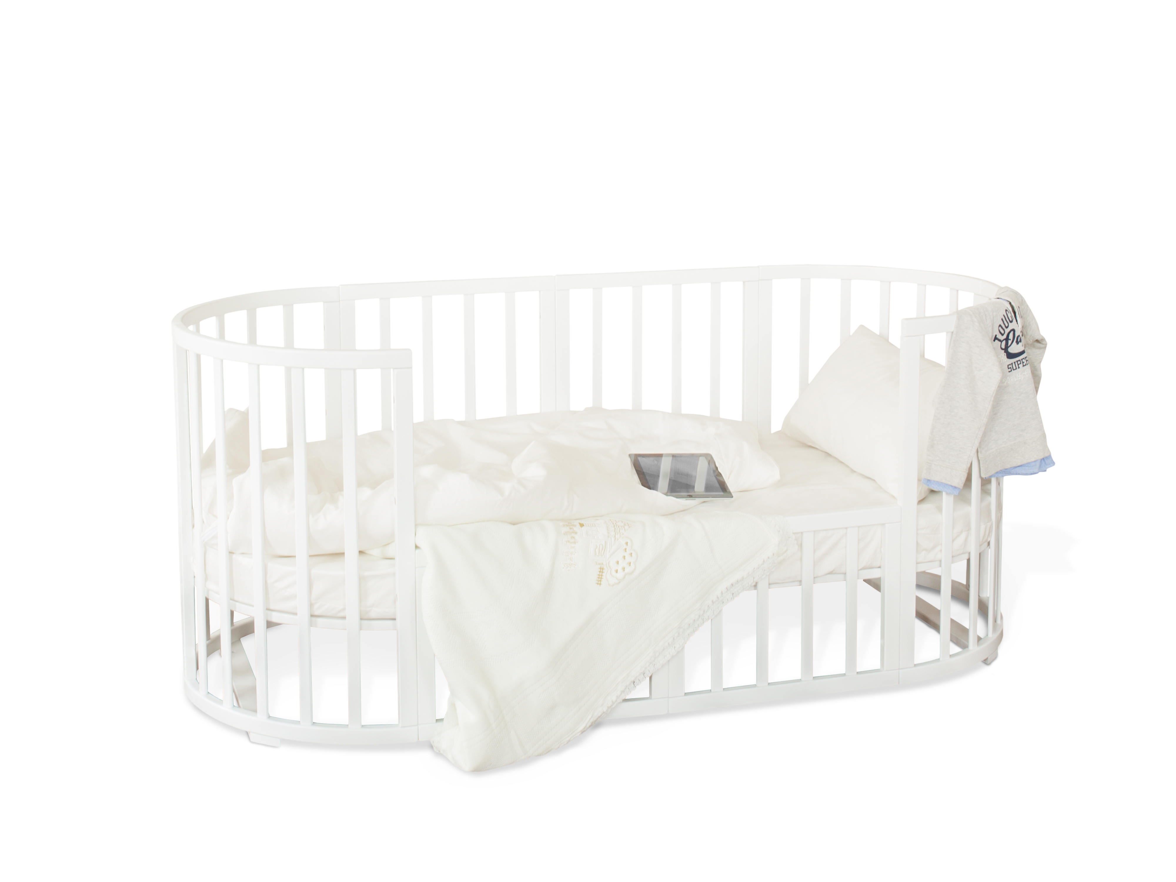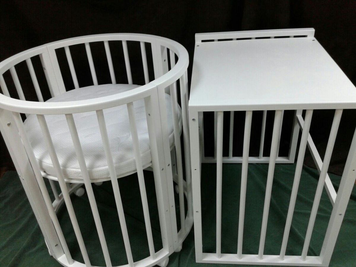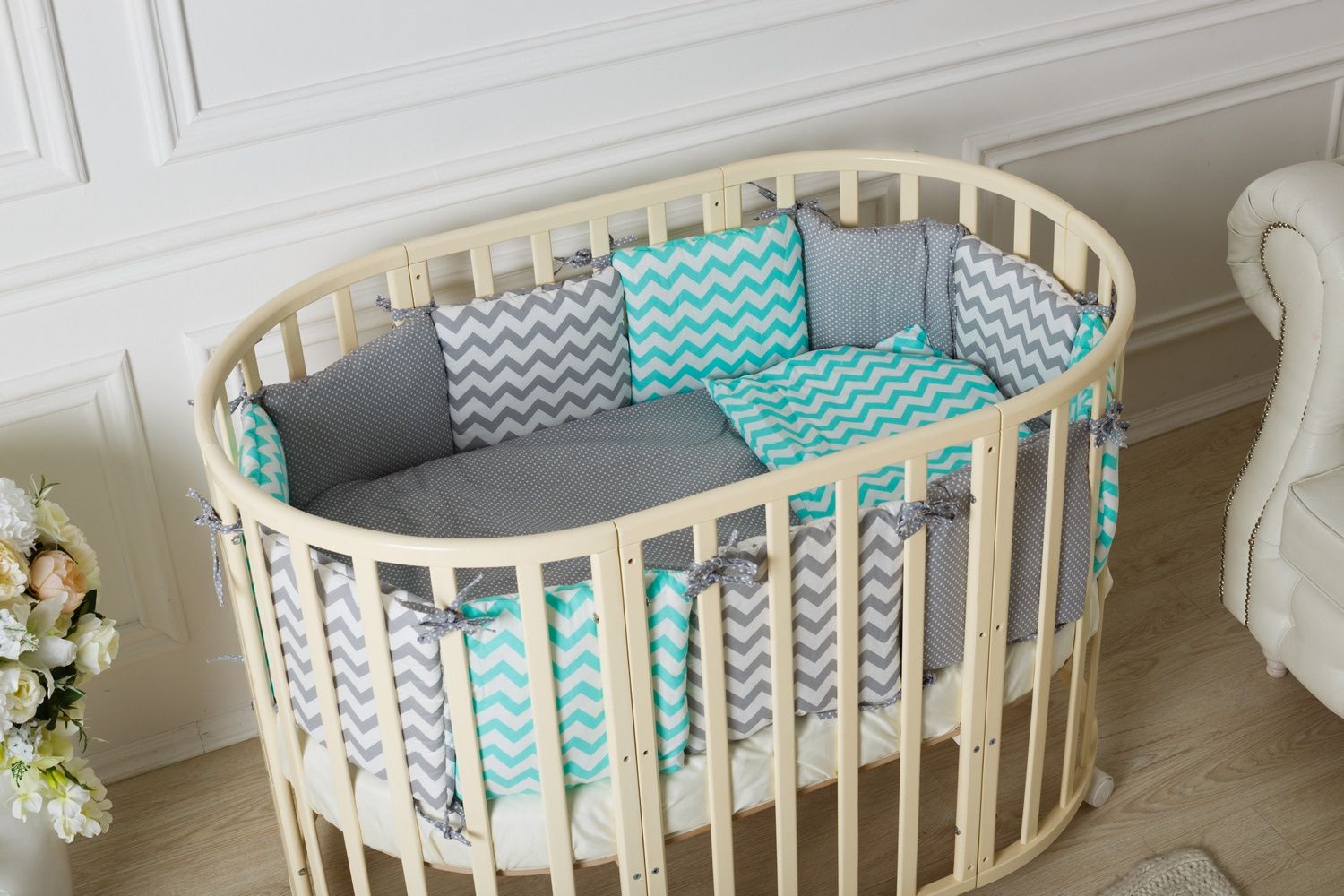 When buying such an original crib as an oval transformer, additional accessories should be appropriate not only in appearance but also in form. First of all it concerns a mattress that comes with a bed, sometimes for an additional price. As a rule, oval transforming beds have two types of completing mattresses. The first is available in two sizes at once: round for a cradle and a large oval for a full bed. The second option has three parts, which are distributed as follows: two smaller halves are in semicircular parts, which together form the cradle, and separately soft armchair, and in the middle is the third part of a rectangular shape, added during the conversion of the cradle into a large bed.