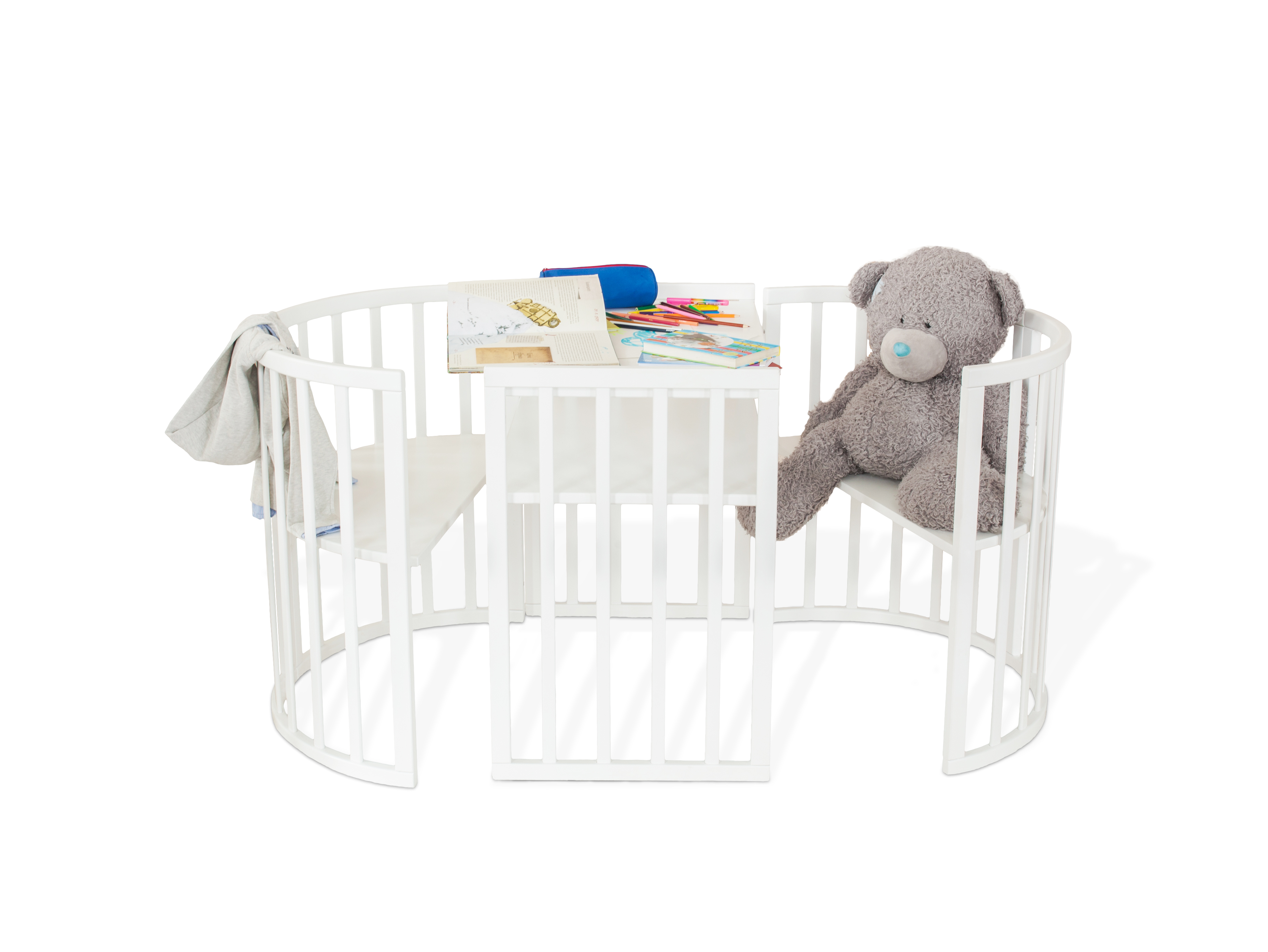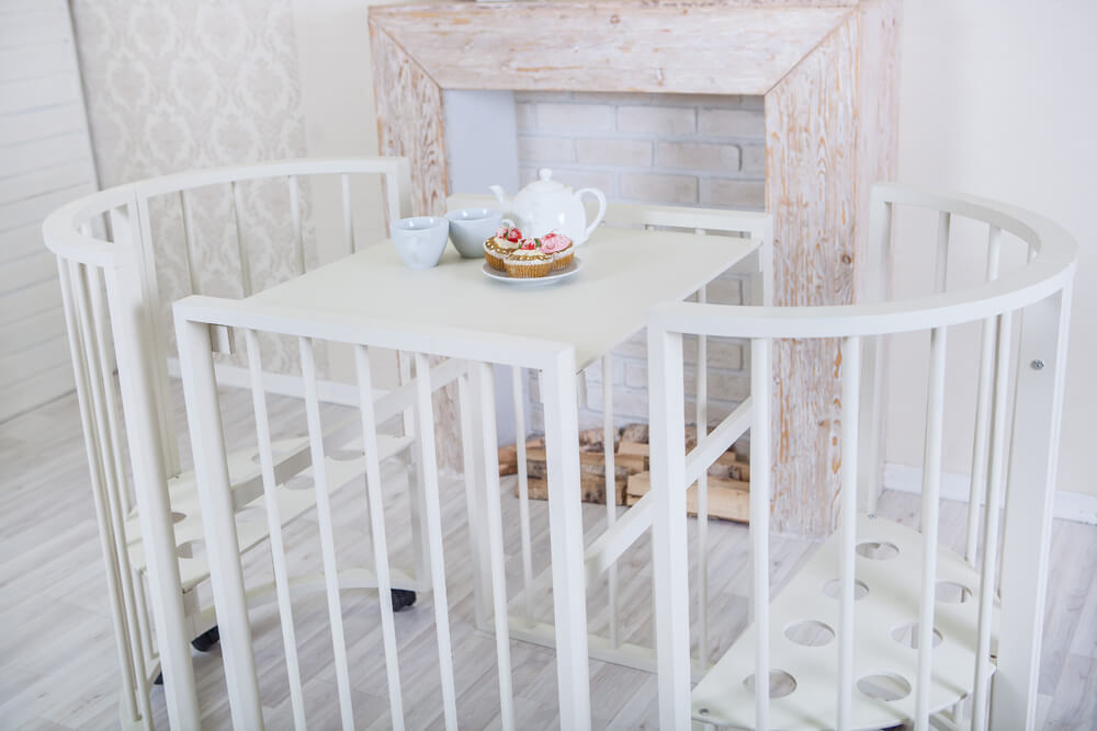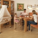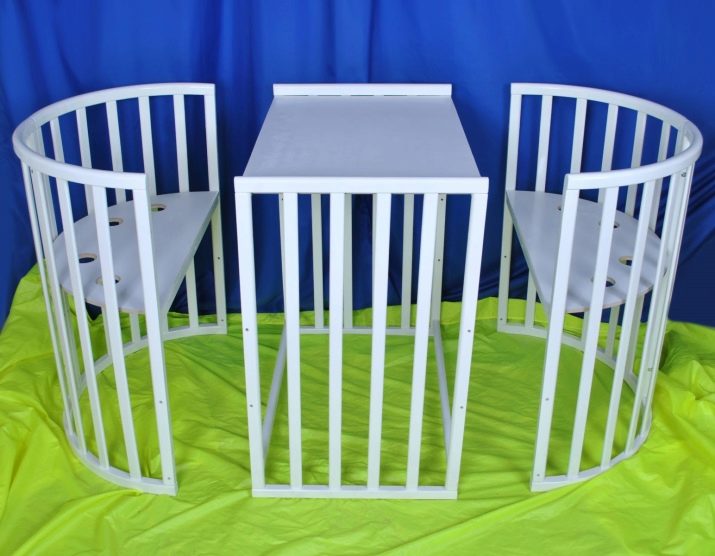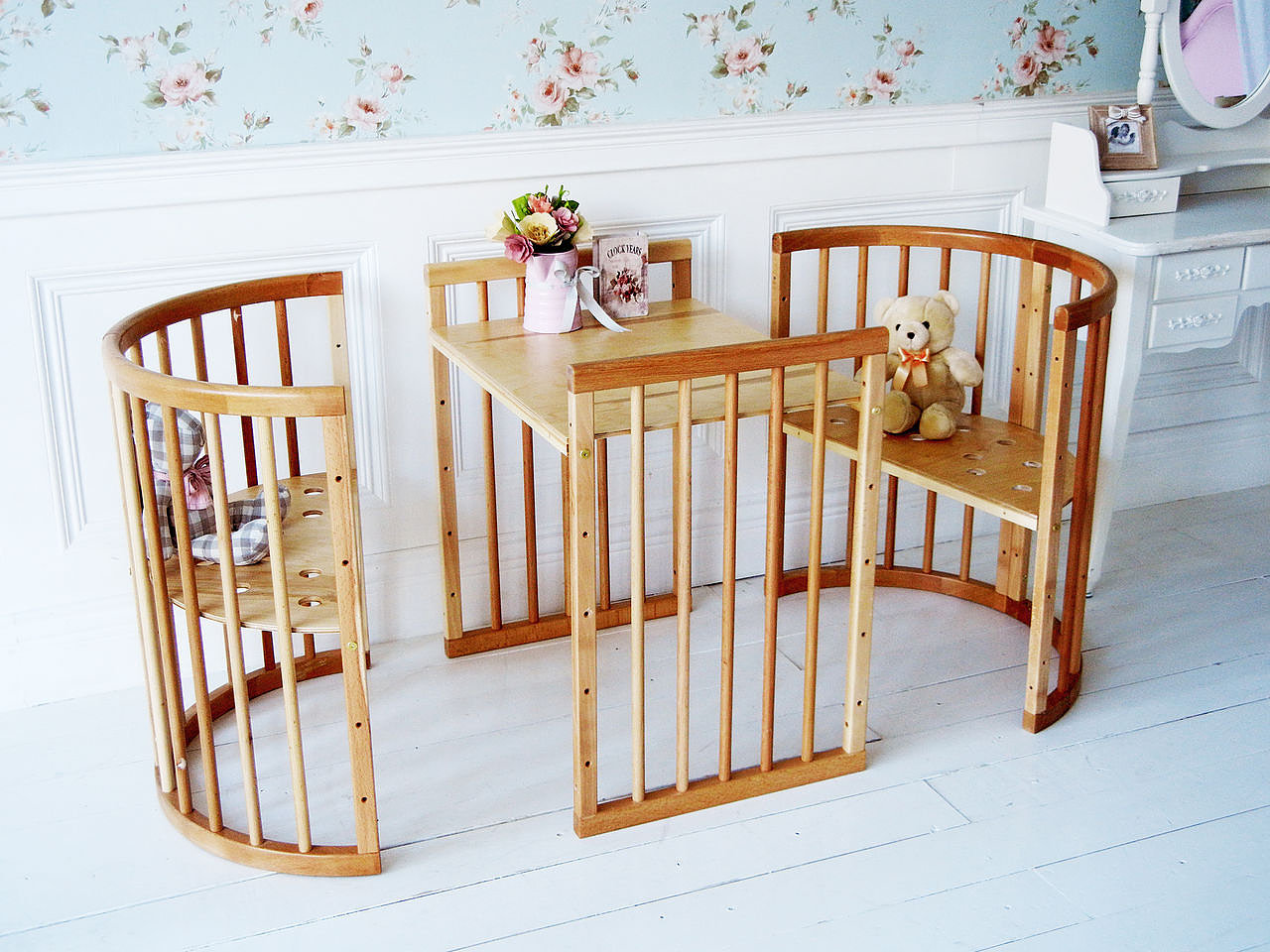 Another transformation option is to turn the bed into a table with two soft armchairs, where the semi-circular parts of the cradle serve as seats, and the middle becomes the table. This technique is very convenient, since the furniture can be installed not only in the children's room, but also taken out to another room or even placed on the veranda in the garden.