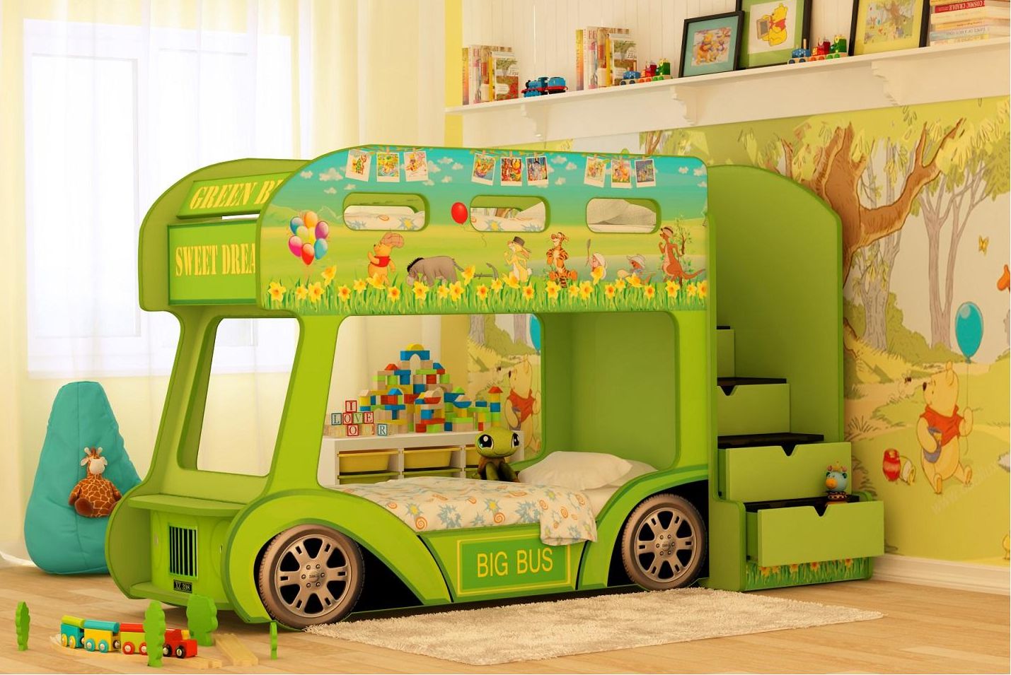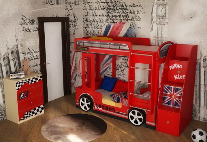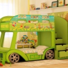 As a rule, it is a bunk bed, which can be in the form of a large bus or a steam locomotive. This bed is strong and comfortable, and it is perfect for a small children's room. The dimensions of the beds are 190 cm by 90 cm. Some models have several drawers or shelves. The ladder can be placed on any convenient side, which allows the bed to be installed anywhere in the room. Material - MDF.