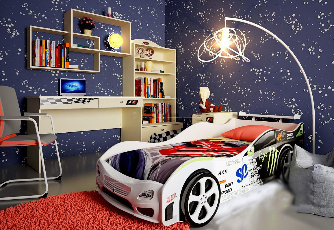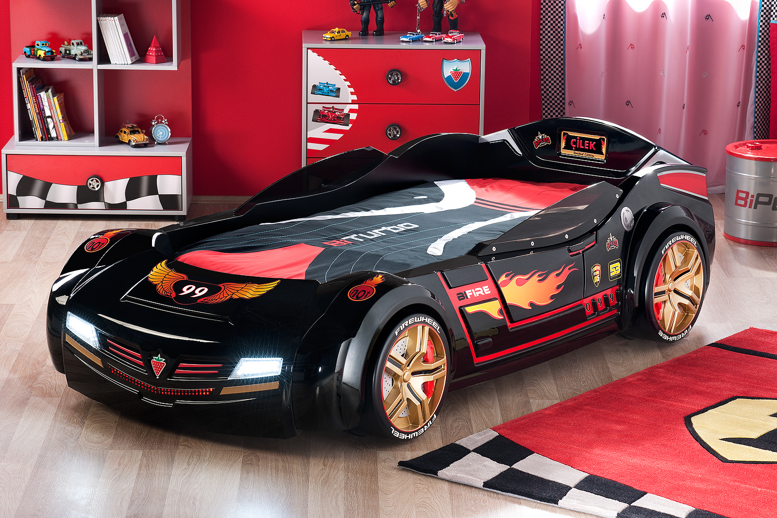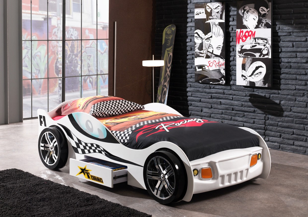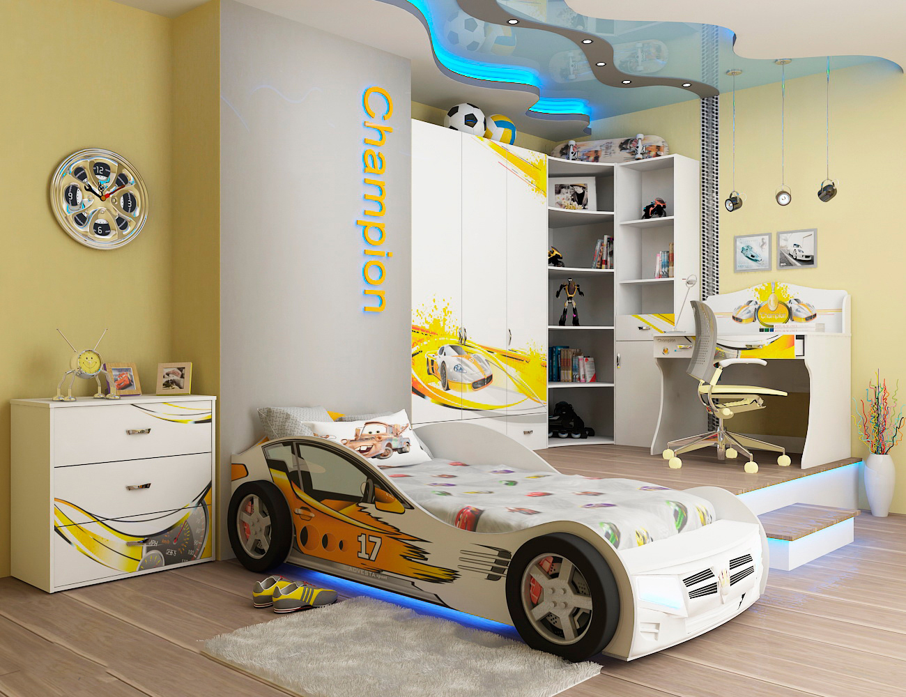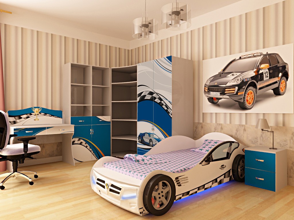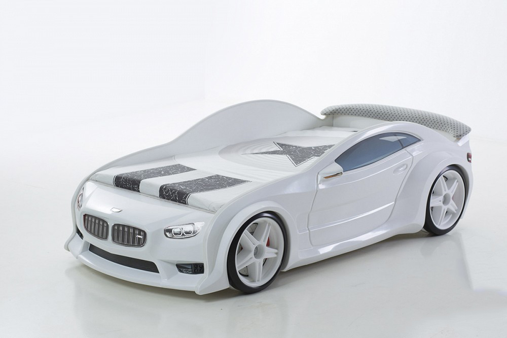 If the bed in the form of a car has a certain brand, then an emblem of this brand can be glued to the wall. For example, a BMW bed and a BMW sign on the wall.