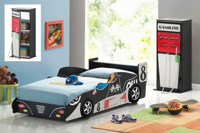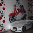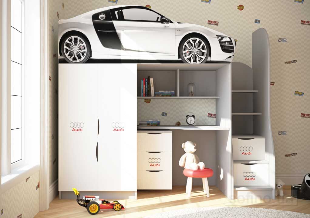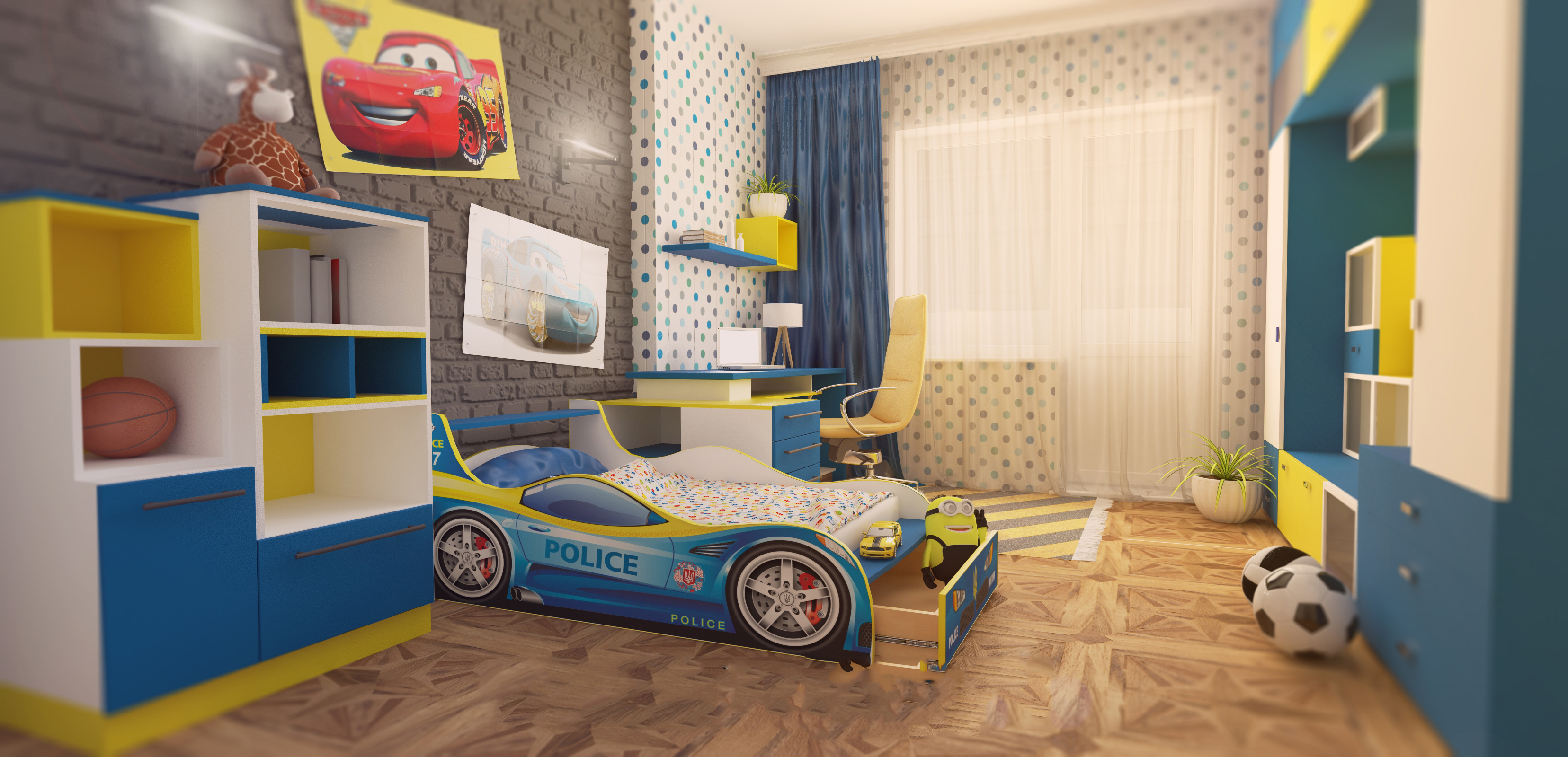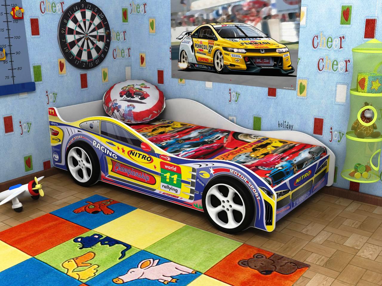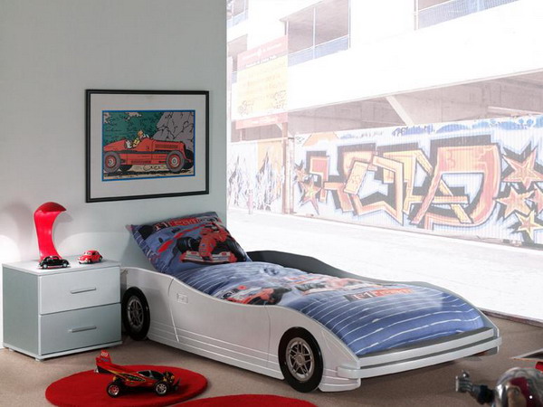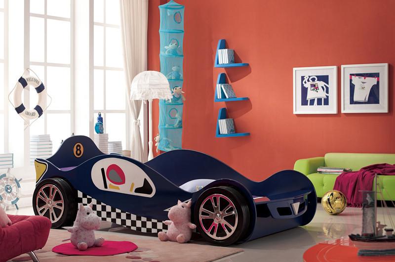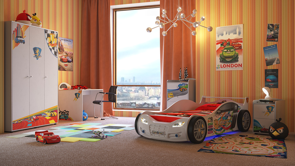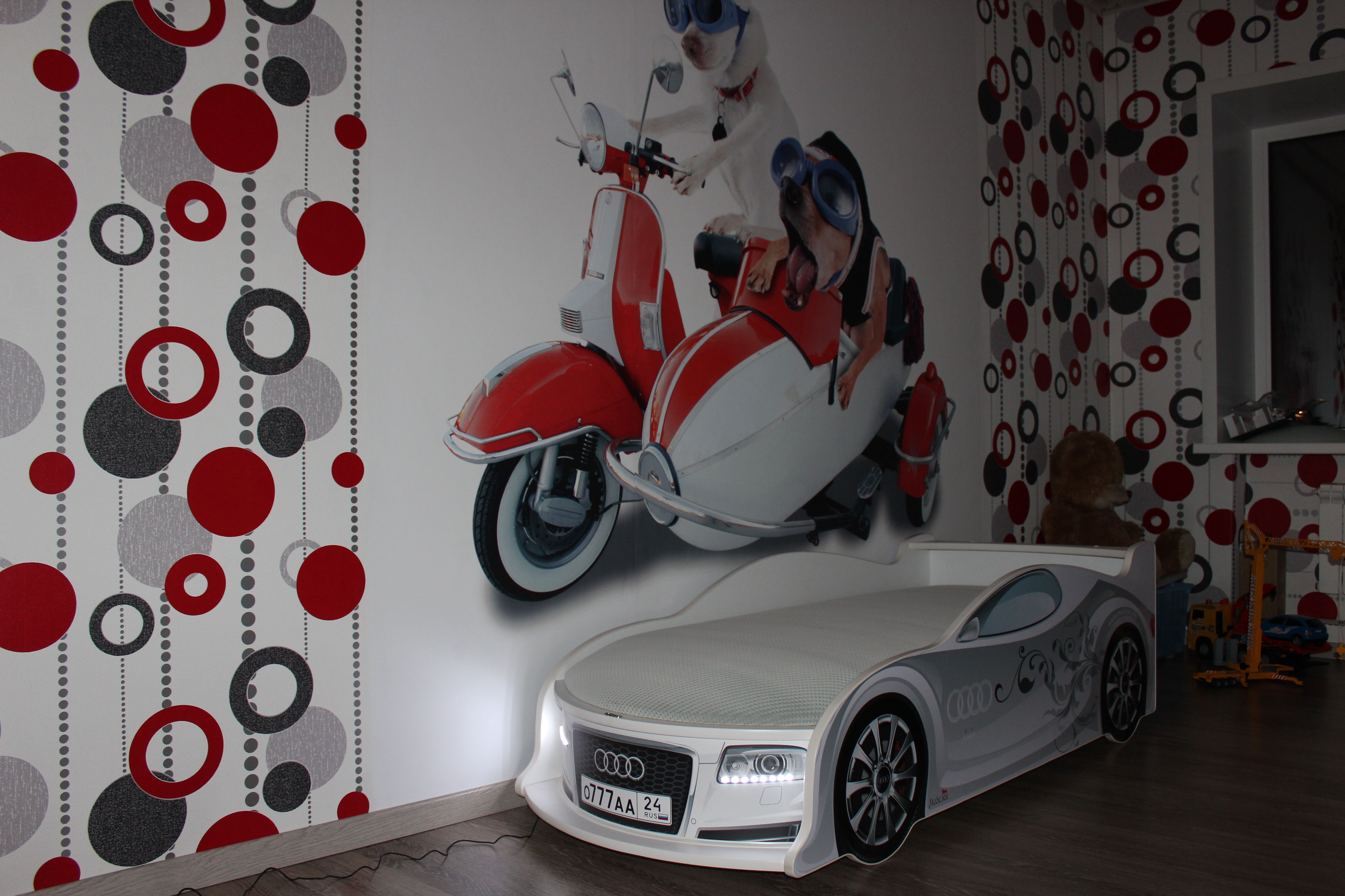 If the bed in the form of a car has a certain brand, then an emblem of this brand can be glued to the wall. For example, a BMW bed and a BMW sign on the wall.