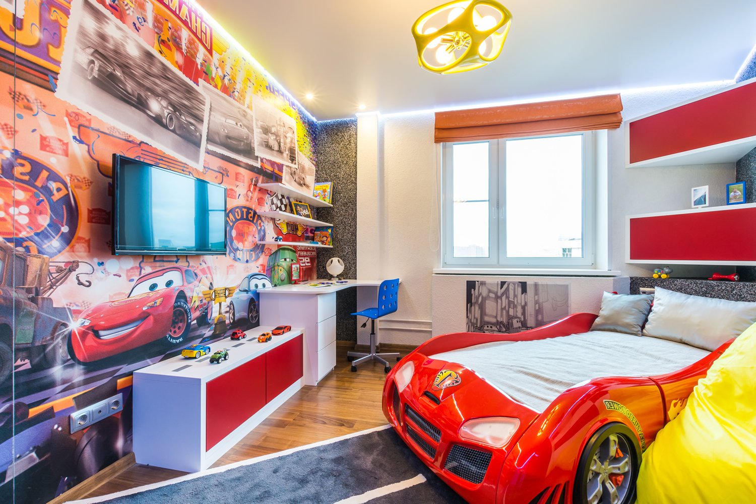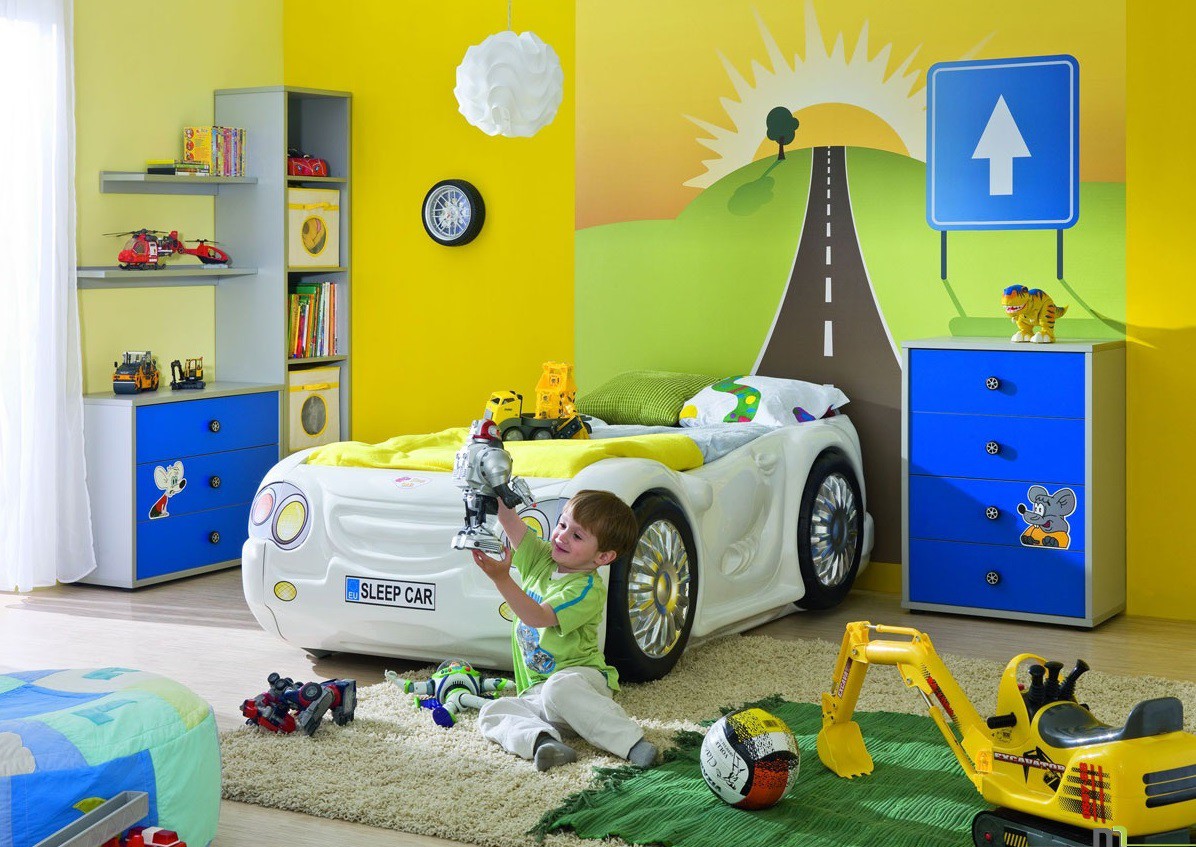 Another option for the design of the children's room is wallpaper with the image of the road in the field. So a bed - the car will ideally fit into the room.