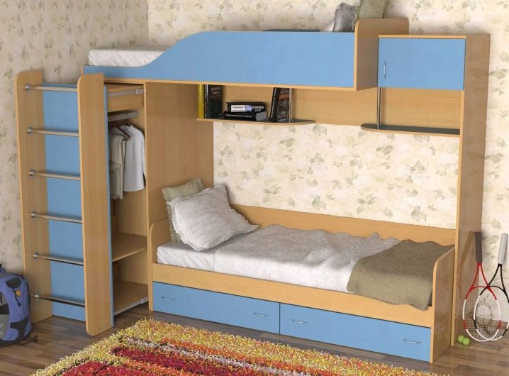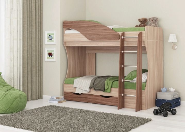 Most often, the lower and upper tiers of Minim beds are represented by two identical beds. The upper bed must have a high protective side, on the lower it may be missing. A convenient staircase allows the child to easily get to the upper tier without the slightest difficulty.